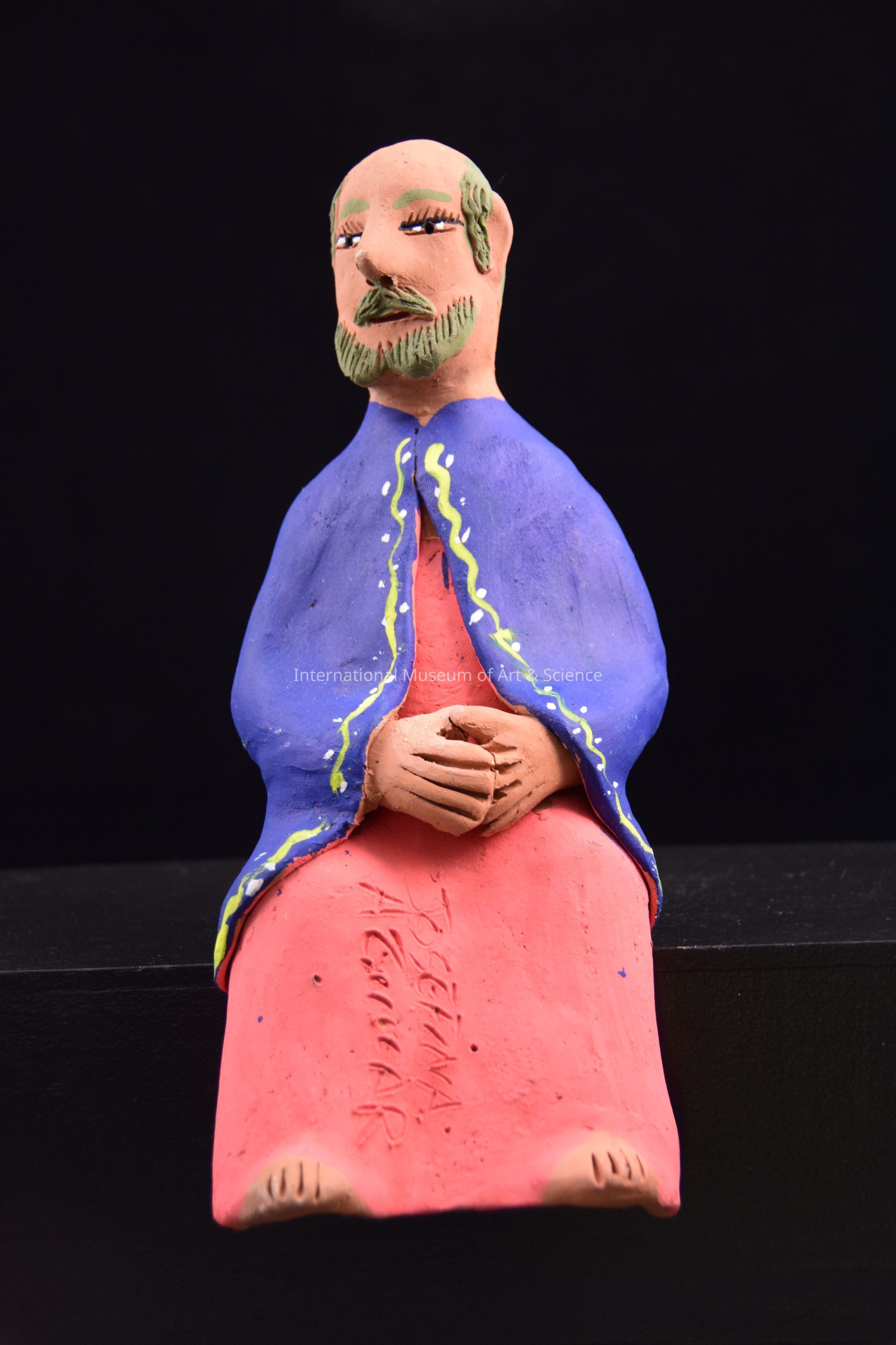 A ceramic figurine of a man. He is in a sitting position. He is wearing a peach colored robe and a navy blue cap with yellow and white detailing. He has a greyish-green moustache and beard, he is balding. He is one of Jesus' disciples from a Last Supper Scene. This piece is part of a Last Supper scene with seated disciples, Christ figure, and tables with food and chairs.