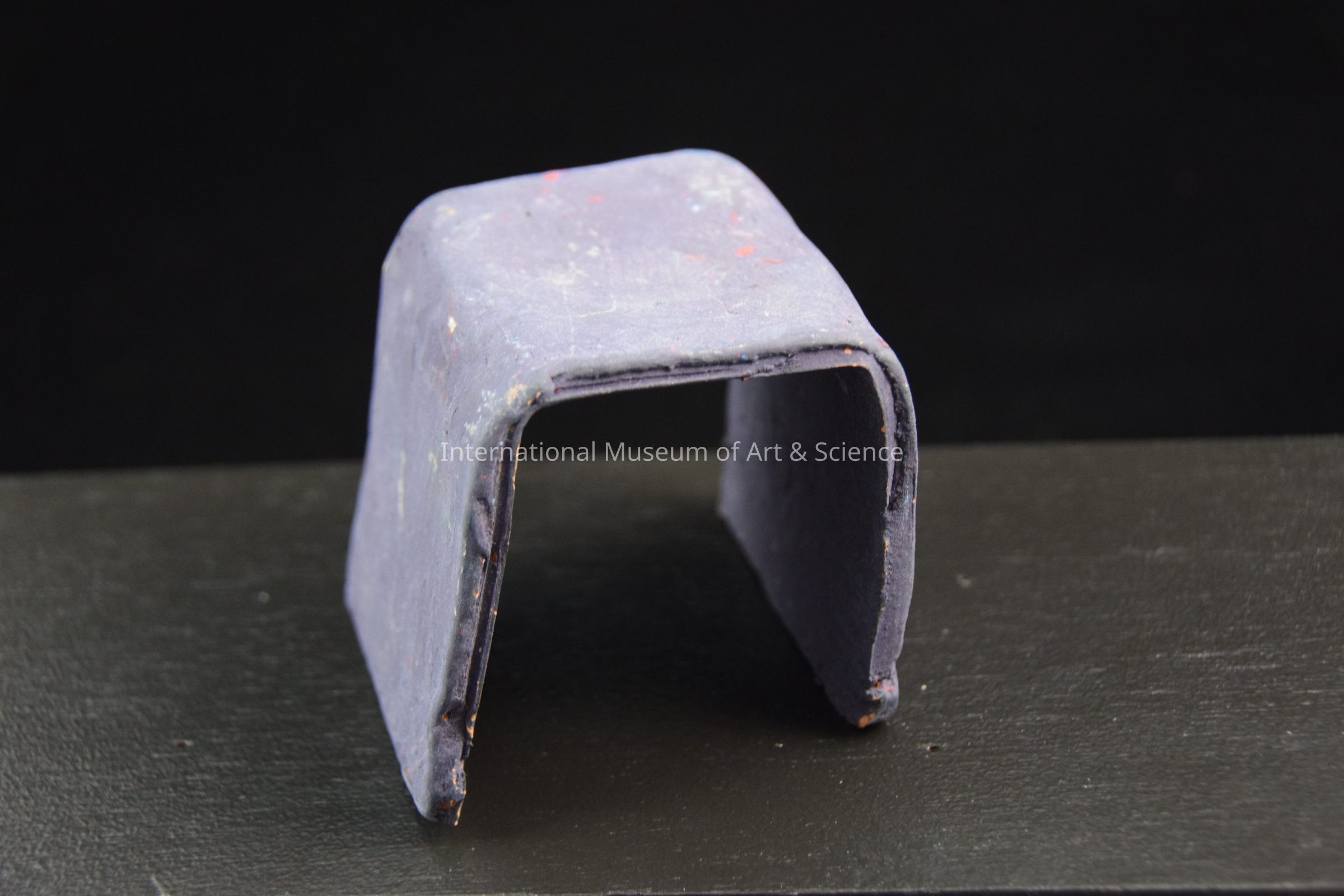 A ceramic figurine of a bench. It has been painted grey and has no back. It is part of a 26 piece The Last Supper Scene.