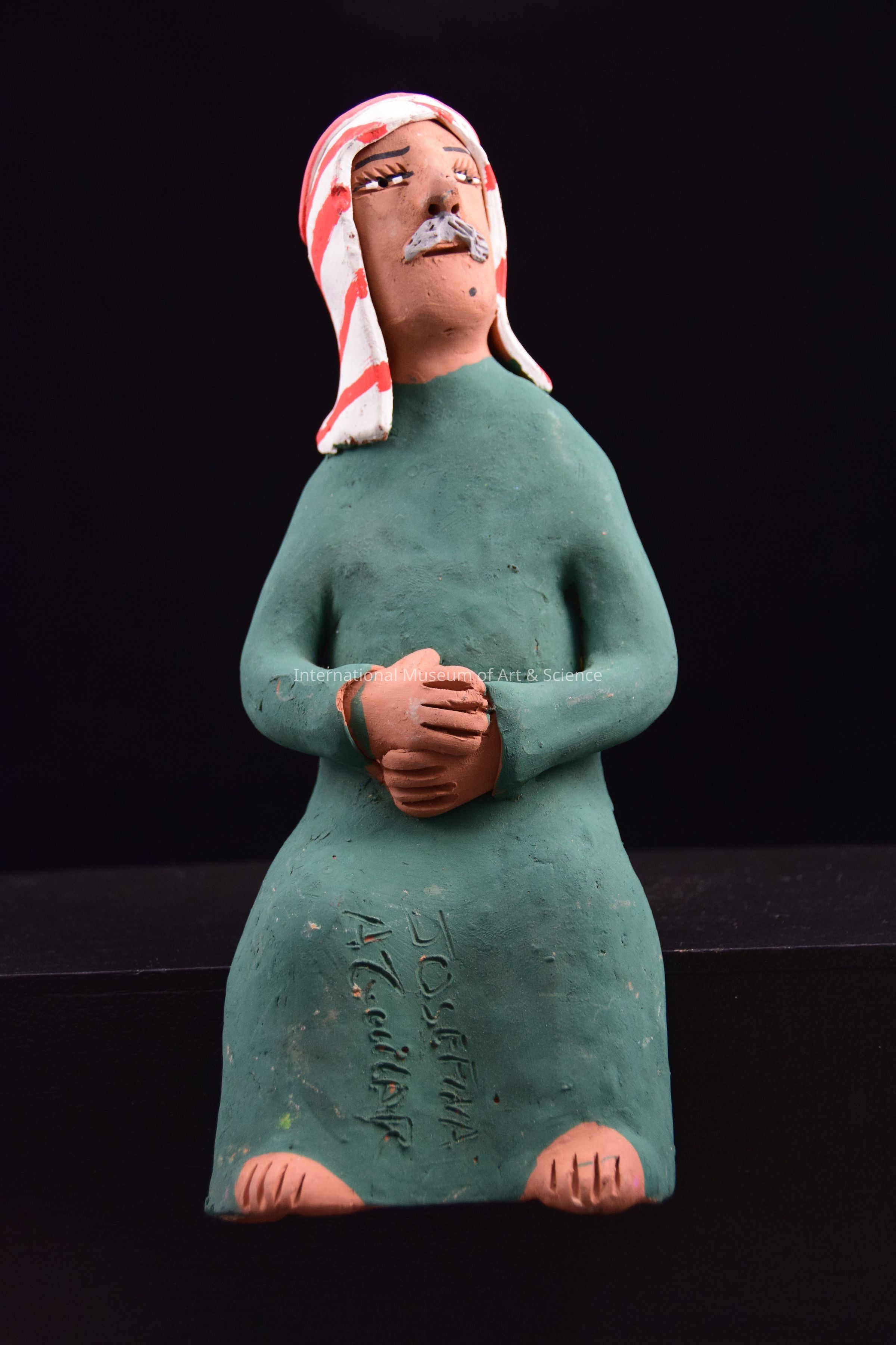 A ceramic figurine of a man. He is in a sitting position. He is wearing a dark green robe and a red and white stripped head covering. He has a grey moustache. He is one of Jesus' disciples from a Last Supper Scene. This piece is part of a Last Supper scene with seated disciples, Christ figure, and tables with food and chairs.
