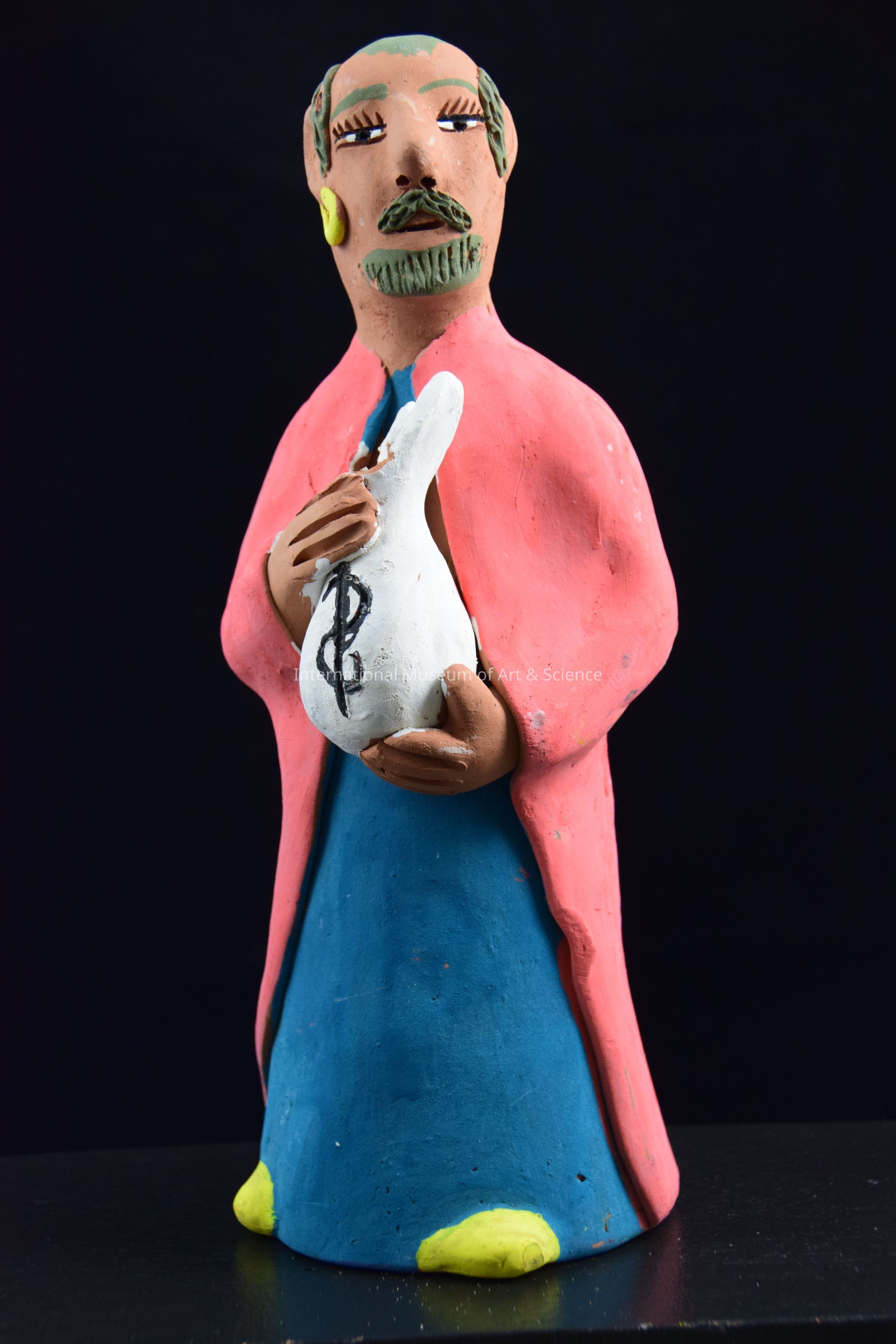 A ceramic figurine of a man. He is standing. He is wearing a teal robe, a peach cape, and yellow shoes. He has a greyish beard and moustache. He is holding a bag of money, so he may be depicting Judas. He is one of Jesus' disciples from a Last Supper Scene. This piece is part of a Last Supper scene with seated disciples, Christ figure, and tables with food and chairs.