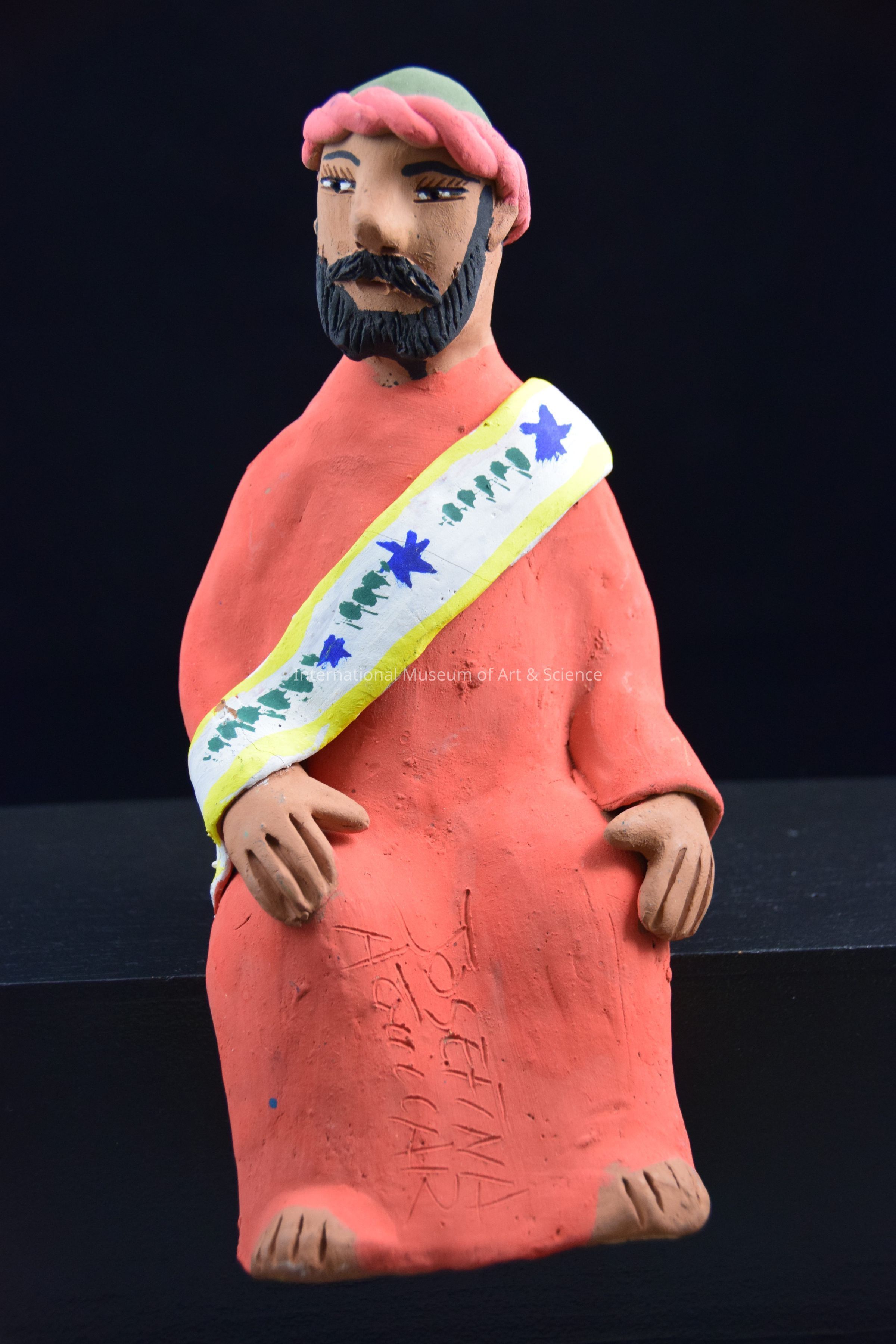 A ceramic figurine of a man. He is in a sitting position. He is wearing an orange robe, a greyish head covering with a peach rope detailing, and a colorful sash. He has a black moustache and beard. He is one of Jesus' disciples from a Last Supper Scene. This piece is part of a Last Supper scene with seated disciples, Christ figure, and tables with food and chairs.