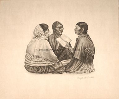 "The Lesson". Elizabeth Catlett. Reproduction of a lithograph depicting two women listening to a third woman holding a book.Dimensions