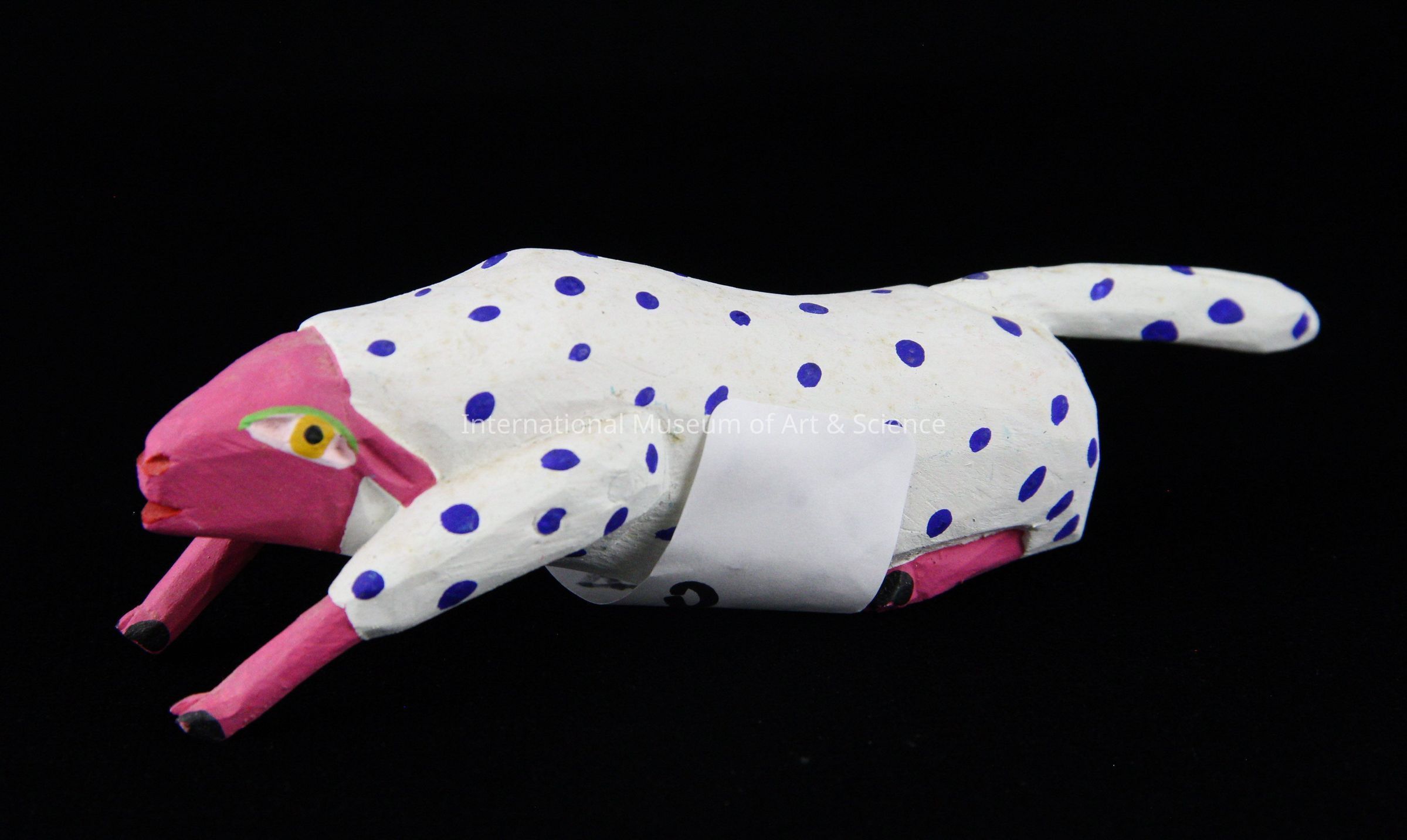 A wood carved figurine of a lamb. The lamb has a pink face and legs, with white and blue spotted wool. It is part of a group of figurines that depicts a kneeling Christ surrounded by seven lambs.Made/Created