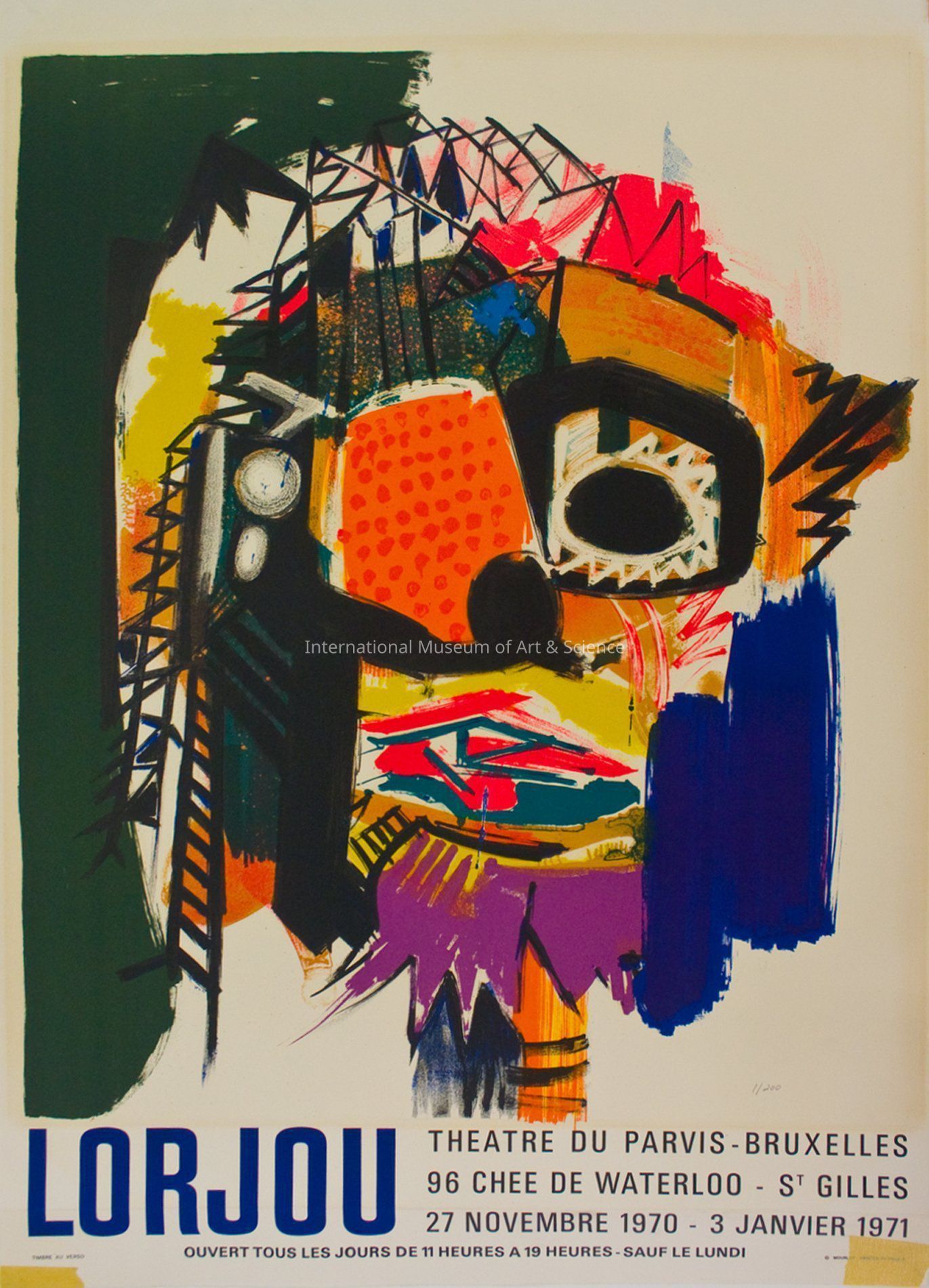 "Theatre du Parvis-Bruxelles". Abstract composition of multi-colored forms varying in size and shape; mostly white background except for dark green leaf edge. Numbered 1/200.Dimensions