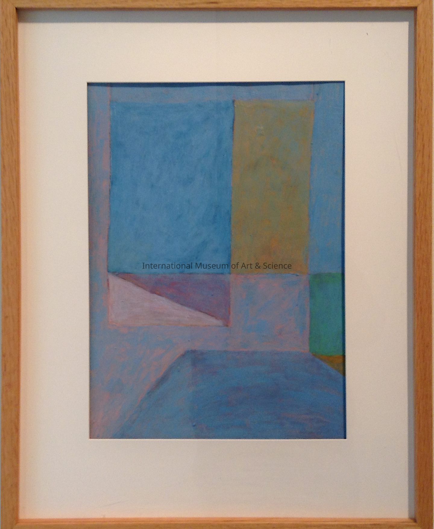 "Third Coast #20." Geometic composition, predominantly medium blues, some green/gold two large rectangles at top, diagonally-divided rectangle and irregular form below. Painterly, transparent surface layer of paint.Dimensions