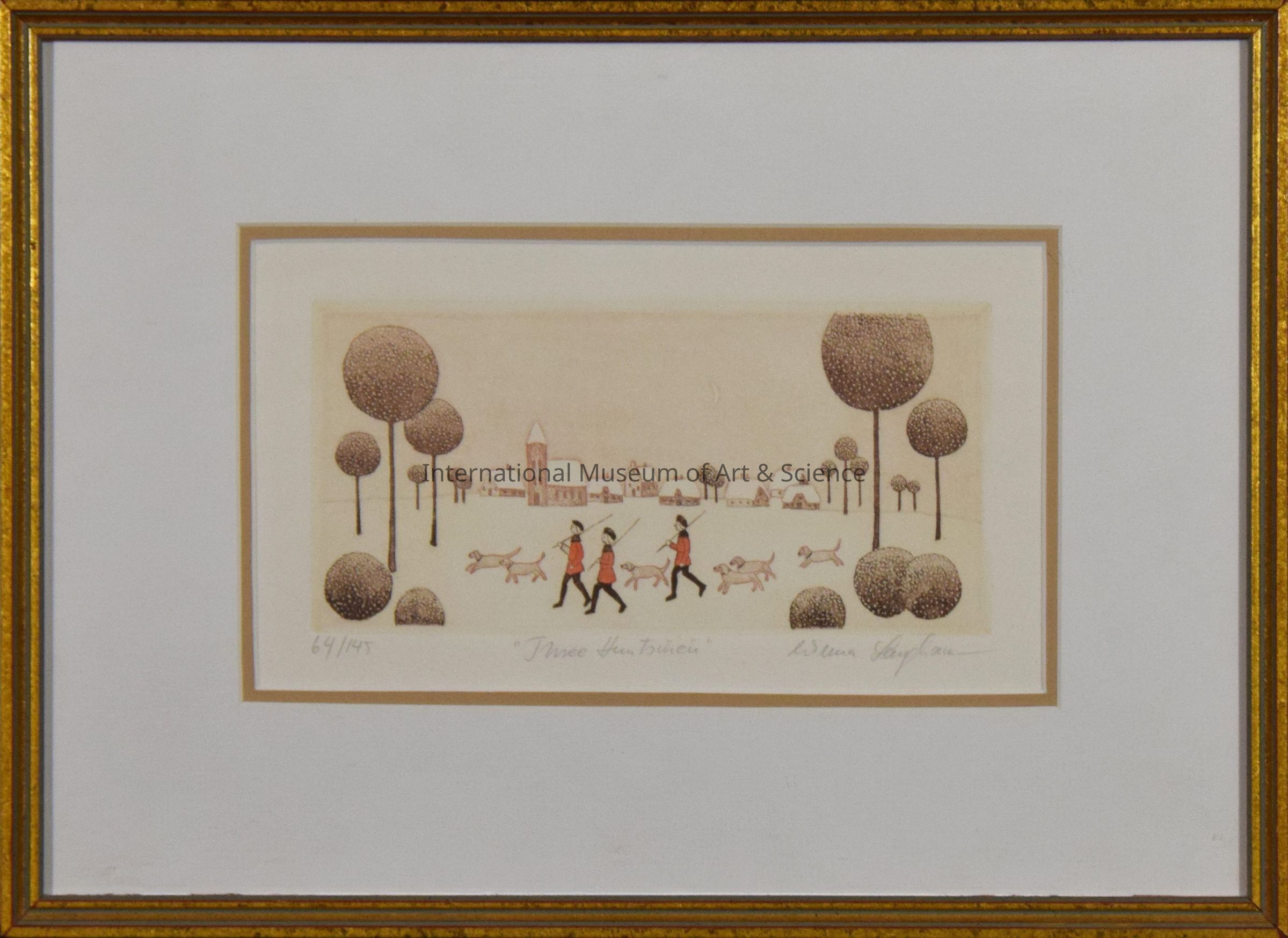 "Three Huntsmen", Wilma Langhamer. Winter scene with three huntsmen in red coats surrounded by a herd of dogs in winter scene with town in background.Dimensions