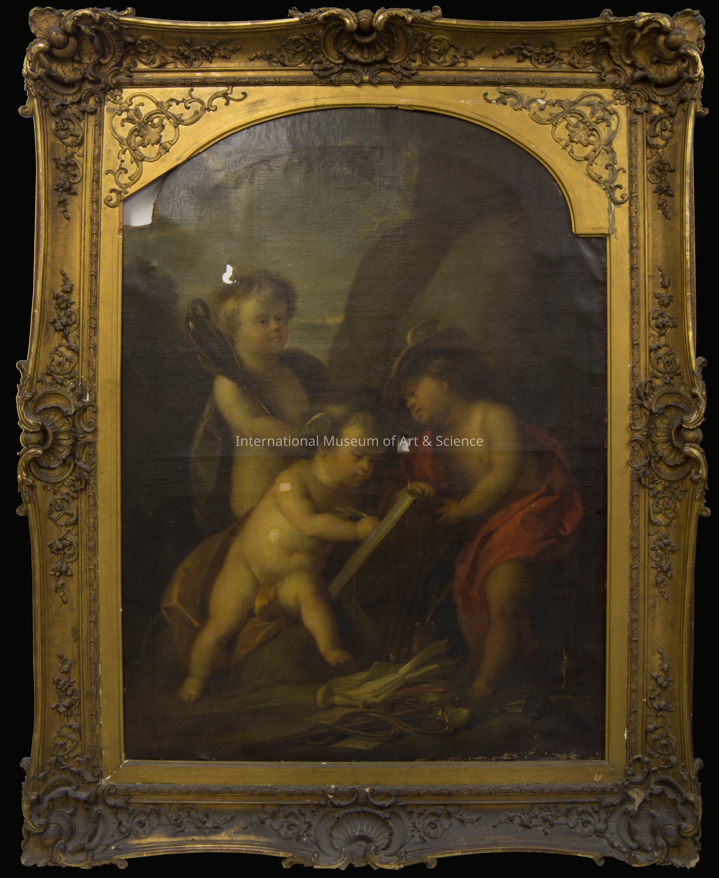 A largescale oil painting of three cherubs. A cherub sits in the center writing in a large book. One stands in the back holding what looks to be a septer. The third is leaning over the book, this cherub is wearing a hat and is draped in red fabric. At the foreground in front of the figures are a handfull of objects: a stack of papers, a candlestick, and a caduceus staff without wings.