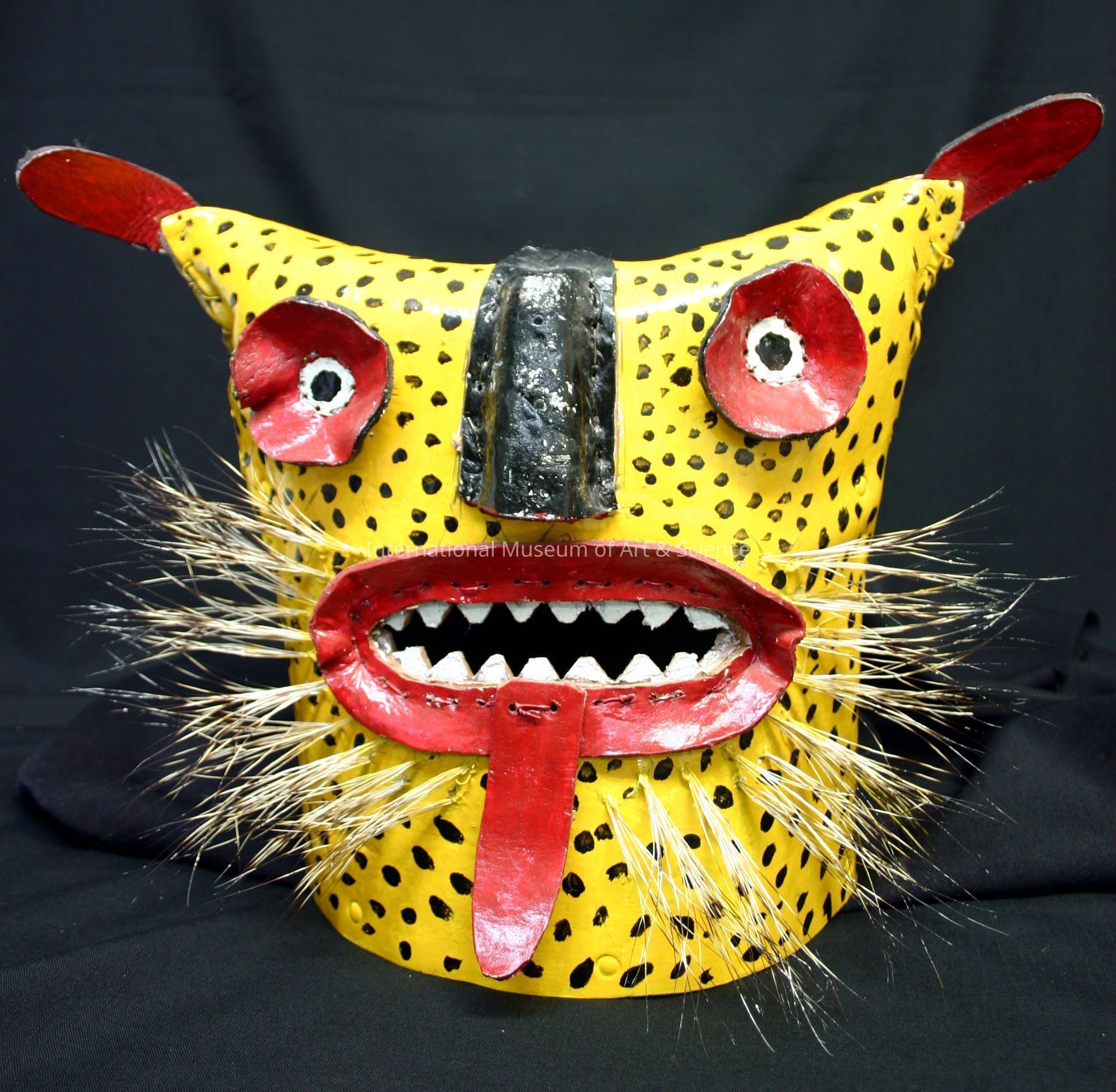 Leather tiger helmet of bright yellow with black spots; animal hair bristles; red leather ears, mouth, tongue; white teeth; black leather nose.Artwork Details