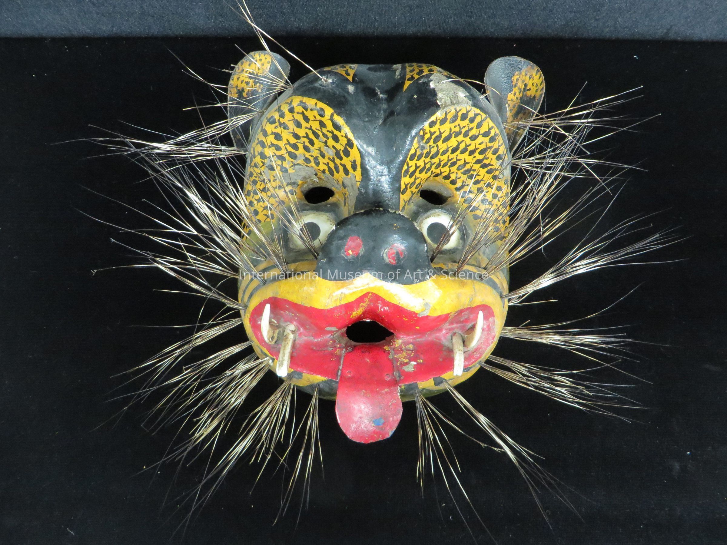 Tiger Mask. Carved wood, painted yellow w/small fish figures overall, red mouth w/leather tongue, leather ears, painted eyes, covered w/platic eyebrows and whiskers of natural bristles, four prospecting teeth. Openings above eyes for wearer.Artwork Details