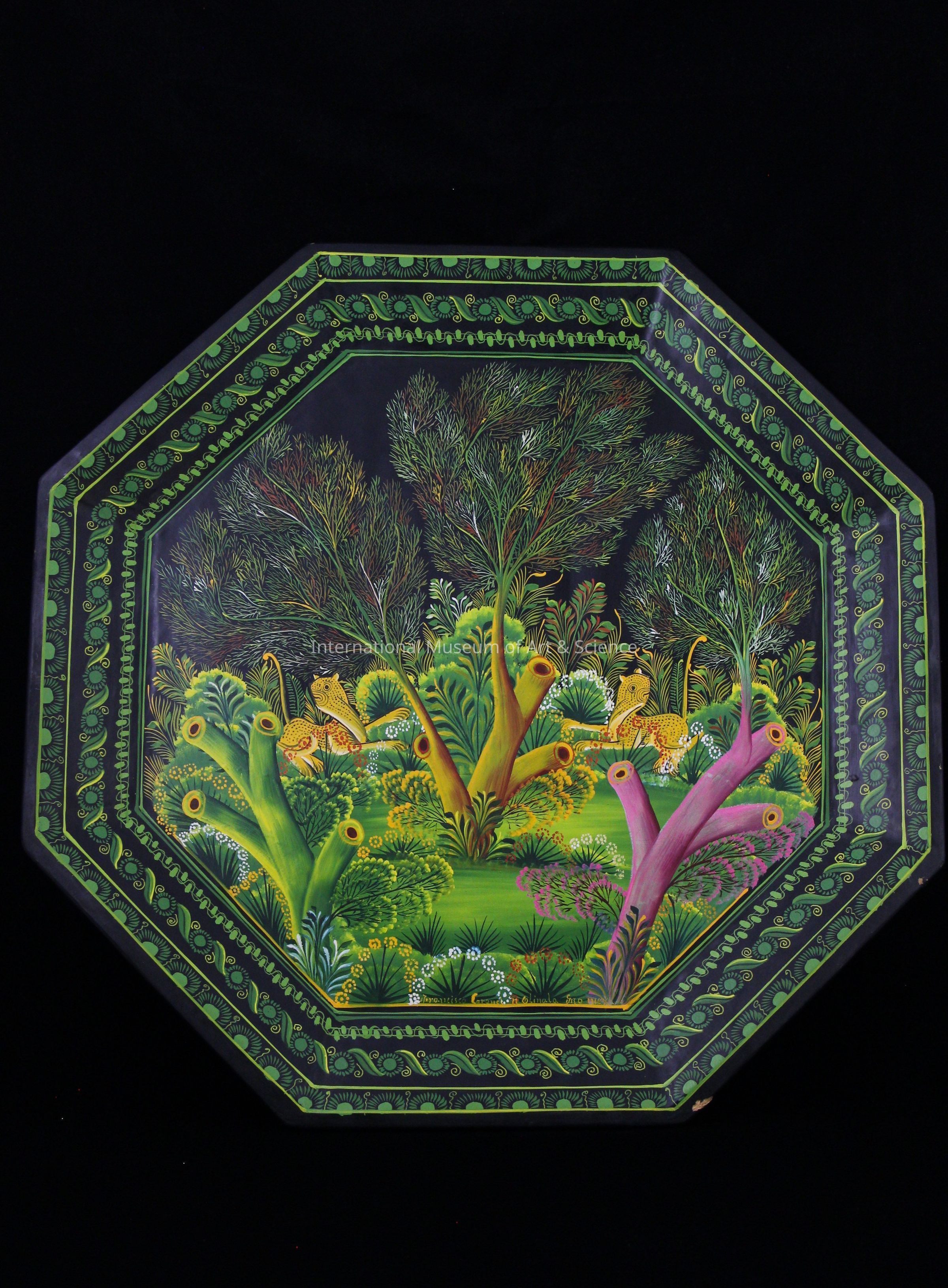A wooden serving tray. The tray is octagonal in shape. In the center is painted a jungle scene with tigers. The colors used include: tints of red, yellow, blue, green, orange, brown, pink, and white.Artwork Details