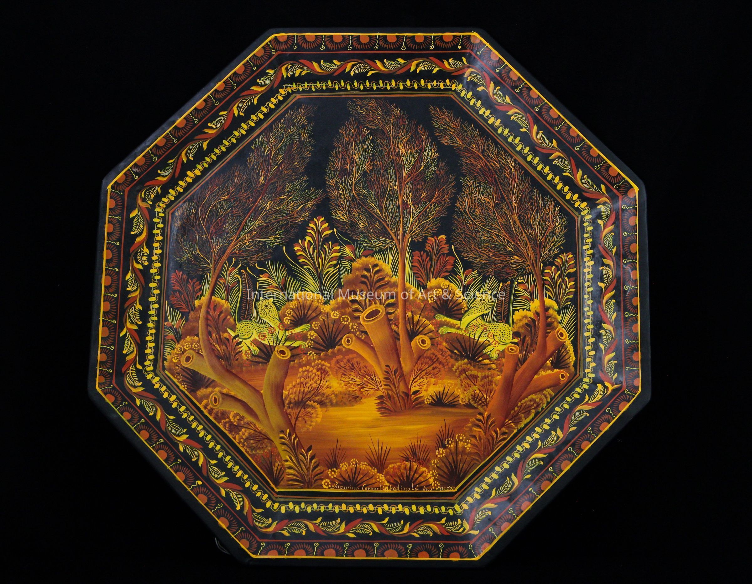 A wooden serving tray. The tray is octagonal in shape. In the center is painted a jungle scene with tigers. The colors used include: tints of orange, browns, and muted greens.Artwork Details