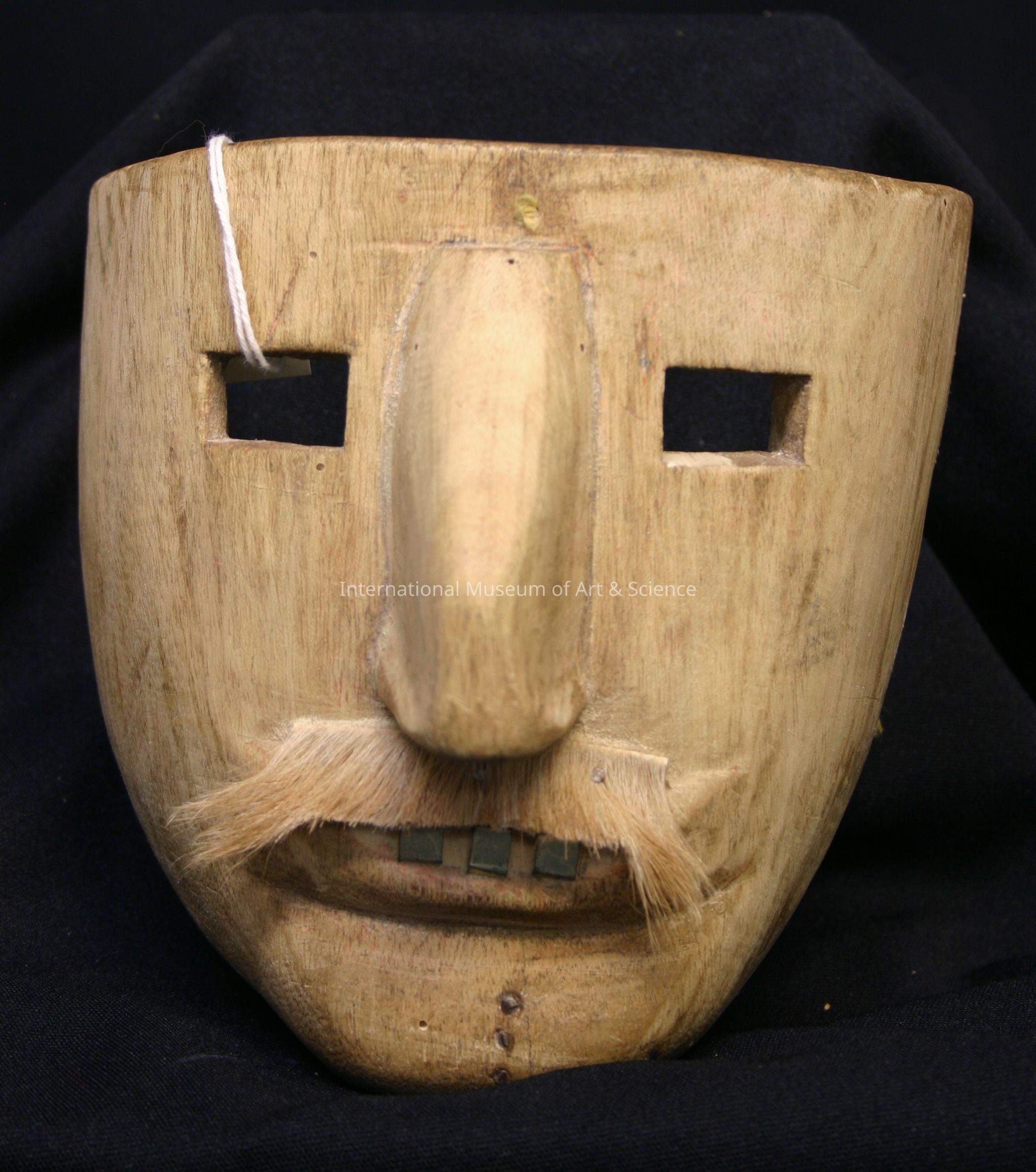 Tlocolero mask. Natural light wood mask; unpainted; beige animal hair as moustache; three gold teeth; square cut eyes.Artwork Details
