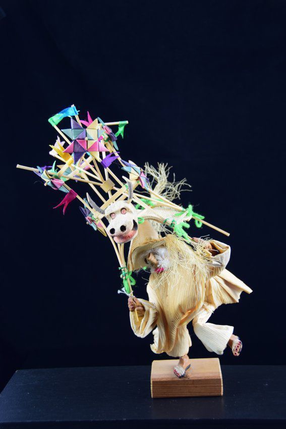 A "Torito dancer" doll. The dancer is dressed in cornhusk leaves for pants, a long shirt with sleeves and pancho. He has a cornhusk hat with cone-shaped top. There is a ixtle band braided around hat. the face of the doll is made of cornhusk, white cotton hair, brown cotton eyes, and a pink neckband. the doll has clay hands and feet painted in dark brown. The dancer is holding large headdress made of bamboo with wooden cow mask with pointed horns at top. The headdress is topped with colorful rayon flags and multi-colored fireworks made of palm leaves and look like stars or flowers. The dancer stands with right foot on square wooden block. Other leg in mid-air as if dancing. Bright green bows hold bamboo sticks tied together.Artwork Details