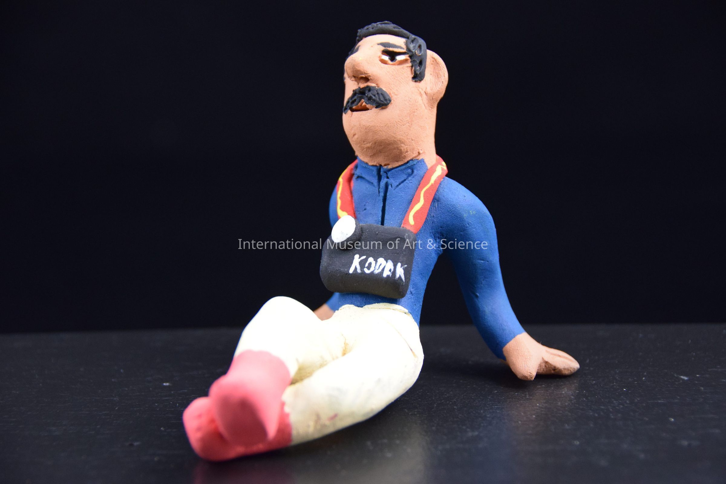 A ceramic figurine of a man. He is in a laid back sitting position, with his legs out in front and his arms bhind to hold himself up. He is wearing a navy bue shirt, cream colored pants, and peach shoes. He has a kodak camera around his neck. He is part of a group of three figurines.