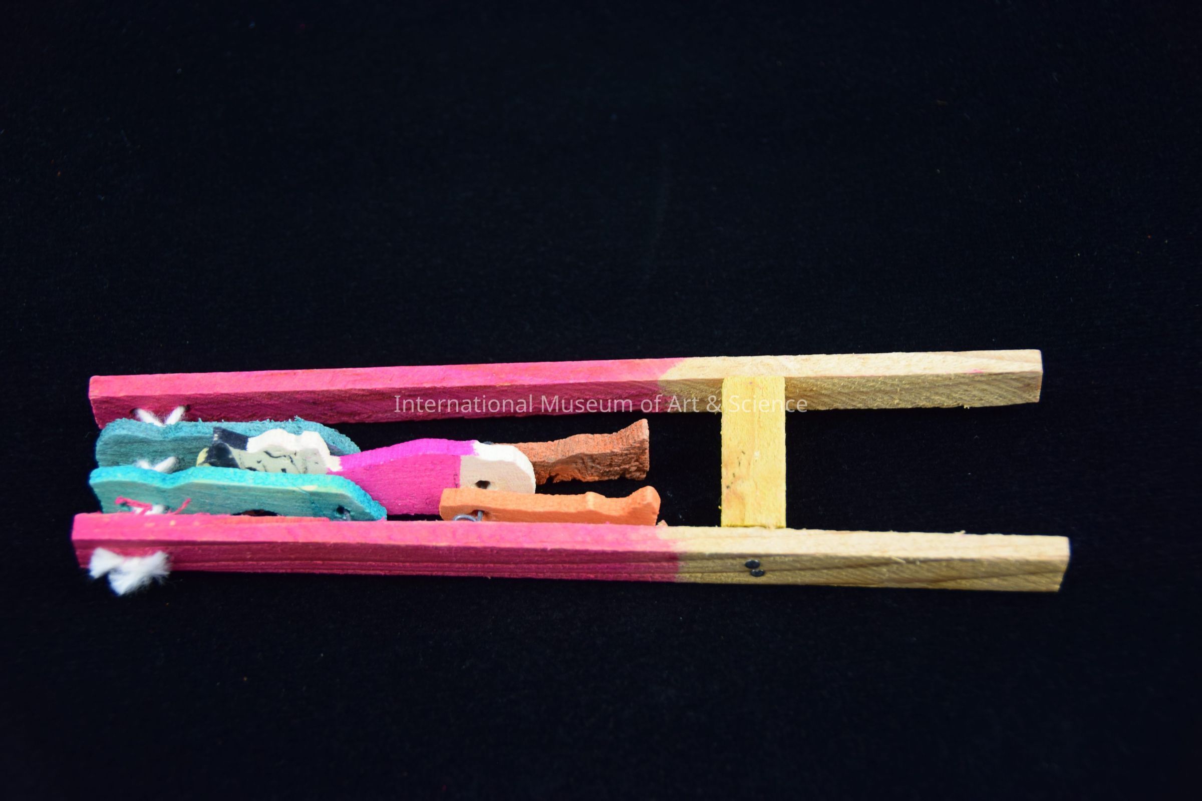 An acrobat toy. Acrobat toy clings to white string bar; swings above and over by pressing two long wooden pieces bottom from the sides; wood painted rose, yellow; acrobat painted green, rose, orange, brown, yellow and black.Dimensions