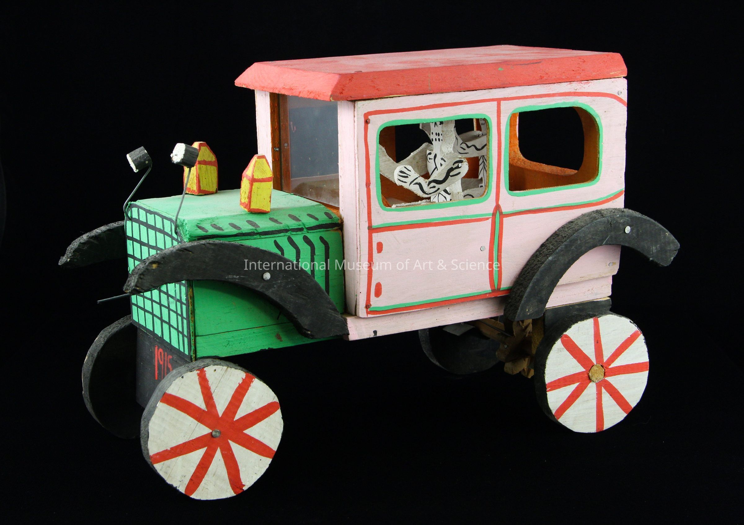 A wooden car with two skeleton figurines inside. The car is painted with multiple bright colors. One of the skeletons is in the driver seat with the other in the back seat. 1915 is painted on as a front license plate.Artwork Details