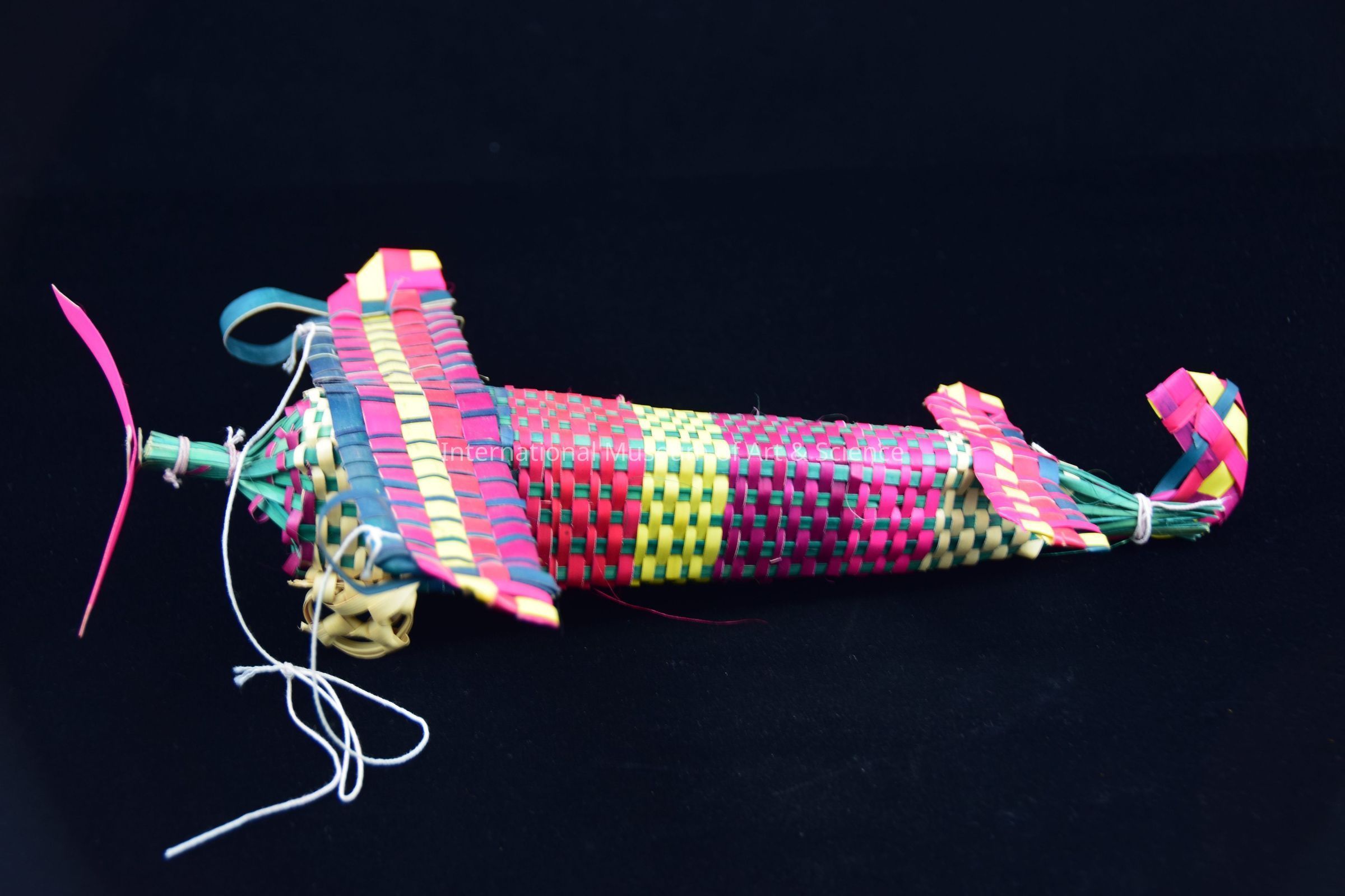 A palm woven airplane toy. It is made of natural and dyed palm leaf strips. It has a rectangular shaped body with horizontal green strips woven with natural magneta, purple, yellow and red strips; red palm propellor. It has wings of green, natural, yellow red, and magneta guano strips. The tail wing of natural, yellow, green, and magneta red, purple, yellow, and green guano strips. The wheels are of natural guano. A cotton string is attached loosely to the front wing and tail wing of the plane.Artwork Details