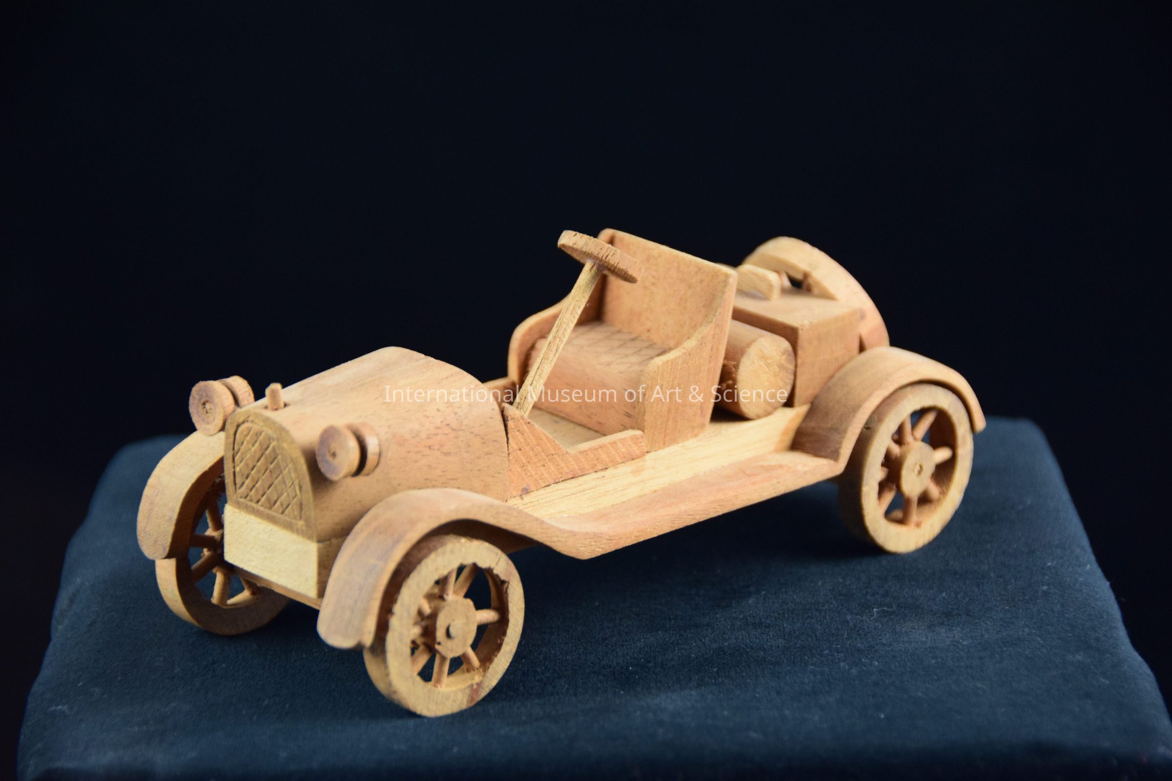 A wood carved miniature automobile toy. The car is unpainted. It has a wheel on the trunk, a high driving wheel in front, no windows or doors, two wooden headlights in front, one front seat, a wooden box and canister behind seat. The license plate reads: "Stutz Bearcat 1914".Dimensions