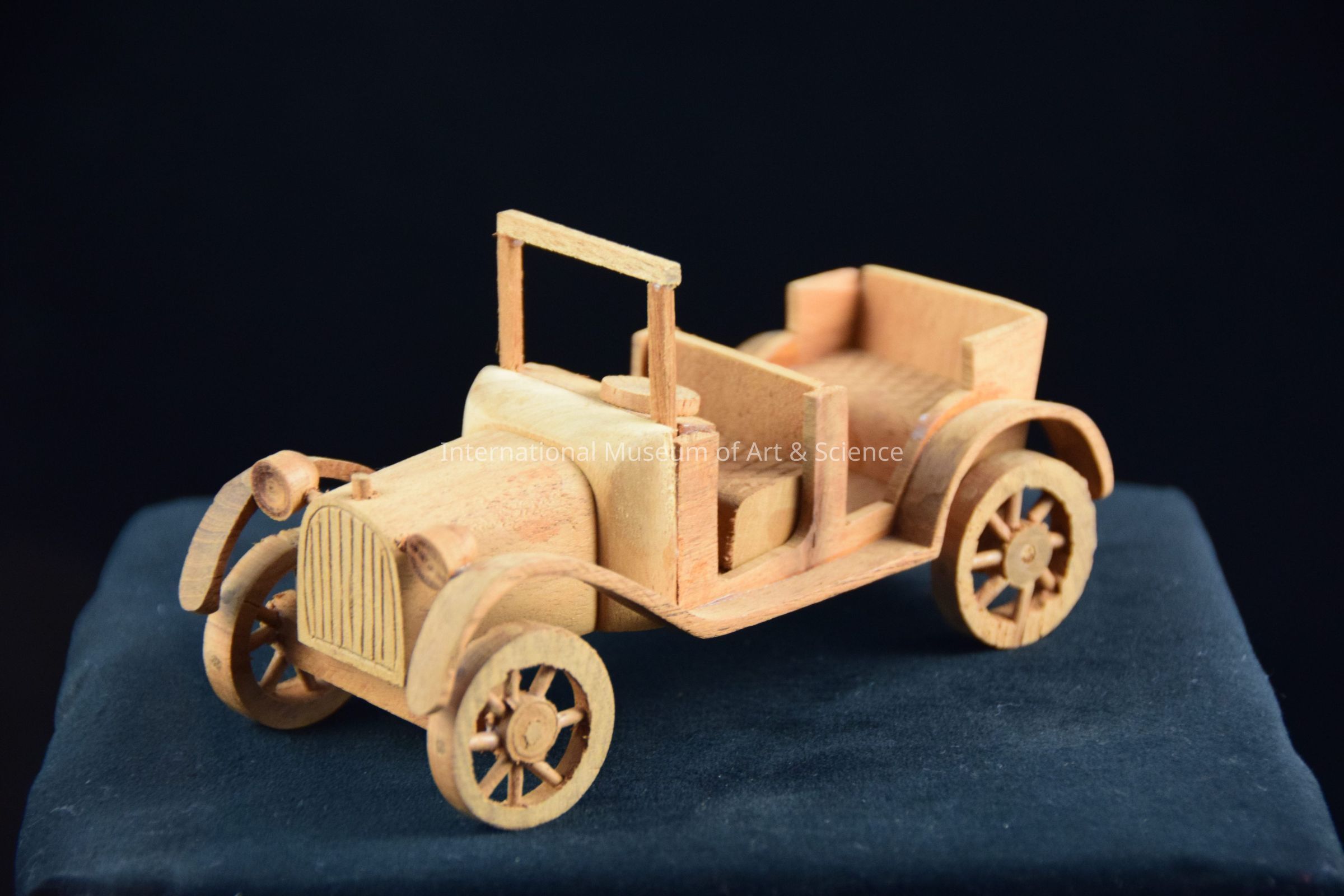 A wood carved miniature automobile toy. The car is unpainted. It has moveable wheels, two seats, a convertible top, no doors or windows, and two wooden headlights inserted. The license plate reads: "Dodge 1915".Dimensions