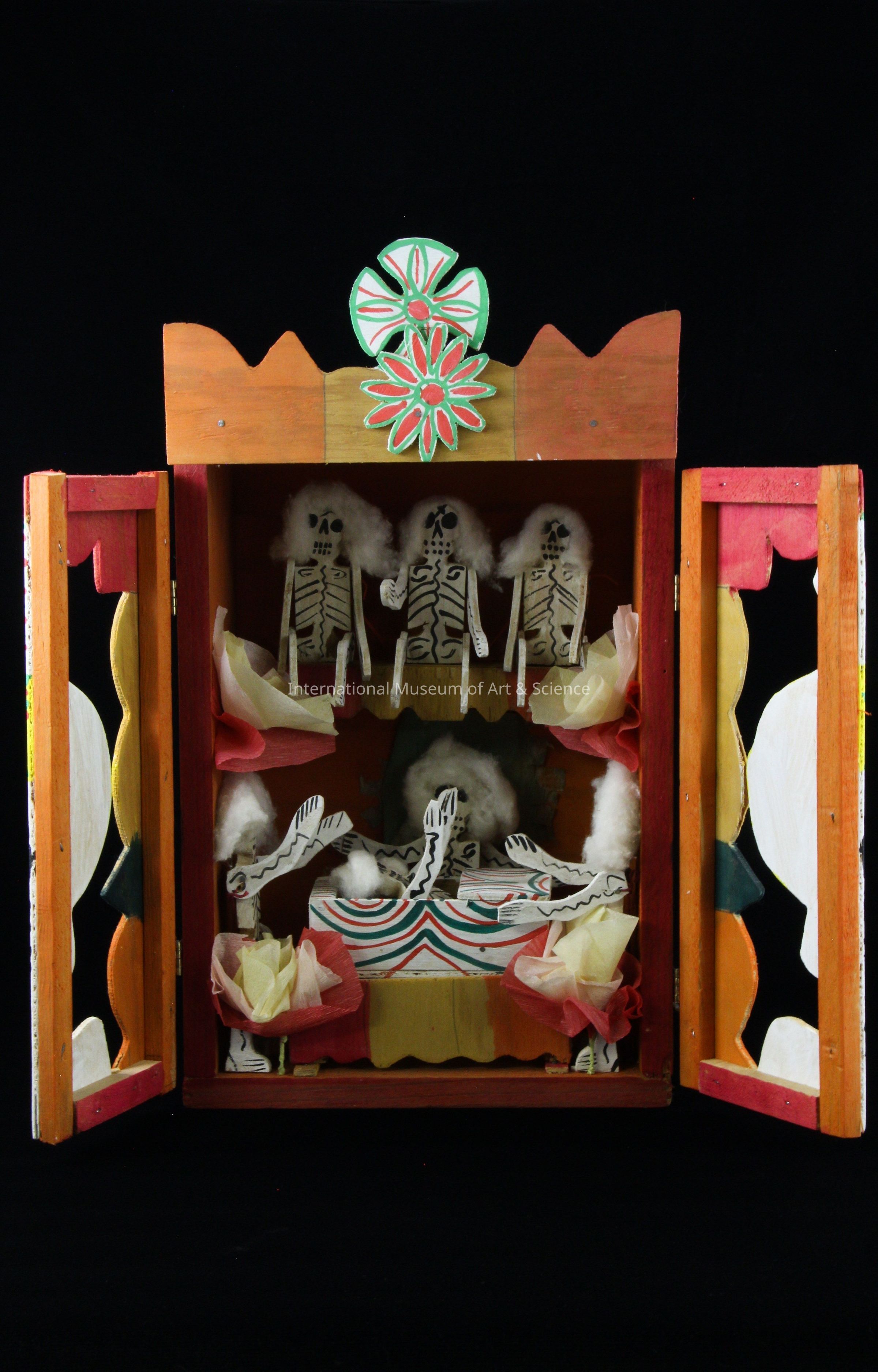 A Day of the Dead folk toy. The toy is a wooden box with doors that shape a skeleton head with curtains behind. When the doors are open, and scene is shown on the inside. The wooden skeletons on the inside move when the toy is cranked.Dimensions