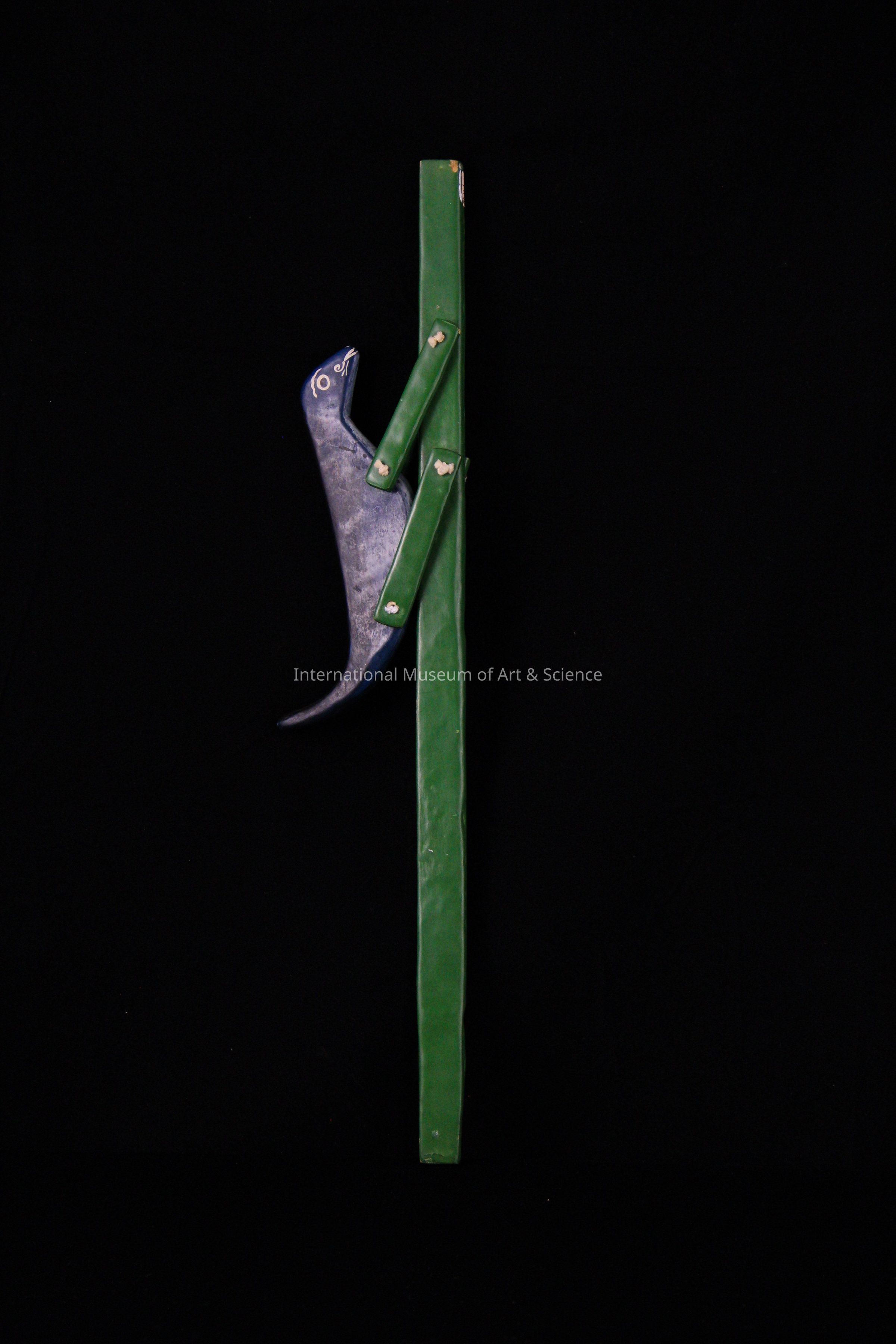 A stick toy. The toy is a stick painted a dark green with a wooden carved bird attached. When the stick is moved, the bird will "jump". The bird is painted a dark blue with white details. The bird's tail is upturnt. The bird is attached to the stick with four small green painted sticks attached to the main stick with string.Artwork Details