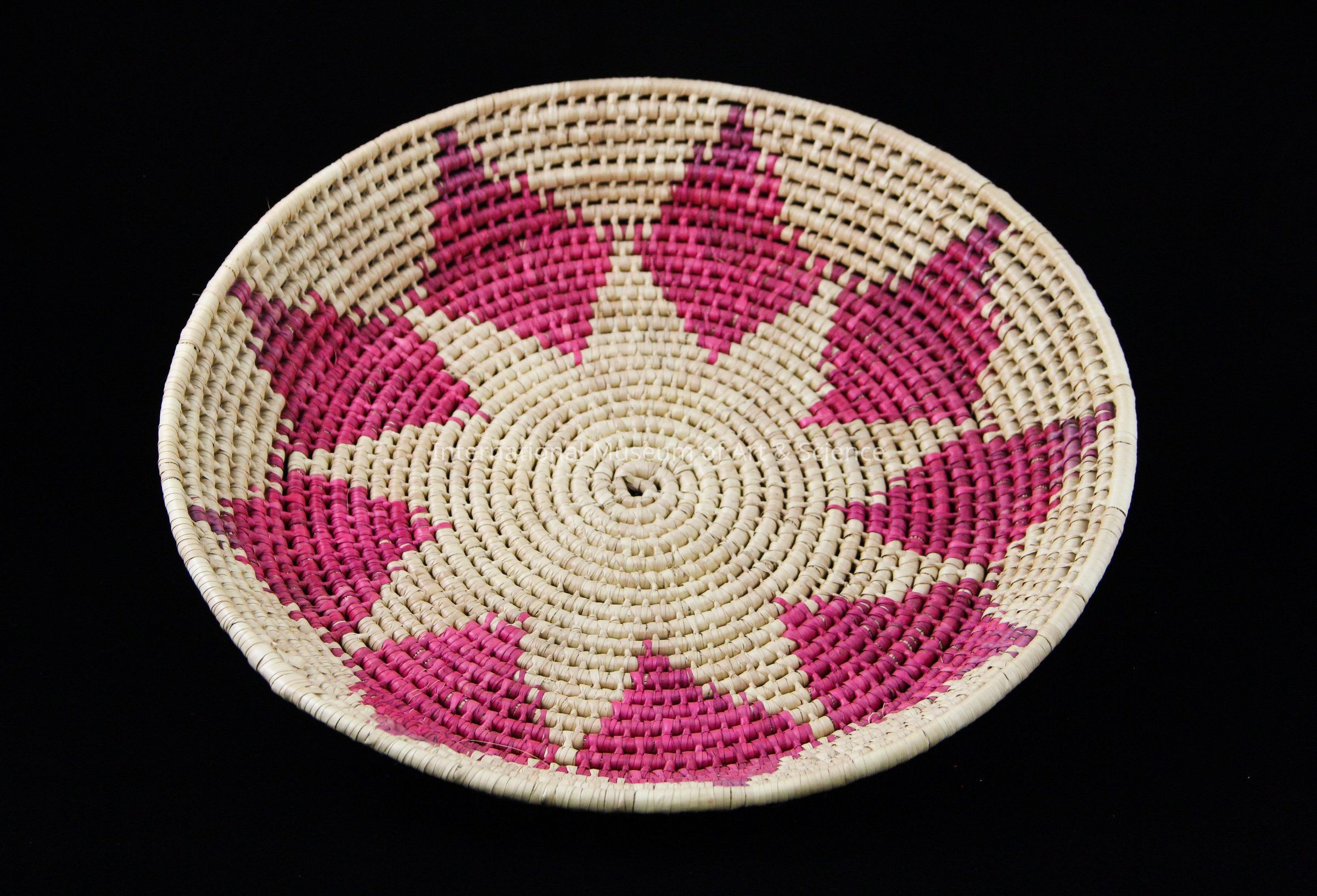 A tray woven of natural and dyed palm leaves. The basket is woven in the coil techique. The base of the bowl is natural in color with natural colors triangles that create a star design that is carried through the rest of the basket in natural and magenta.Artwork Details