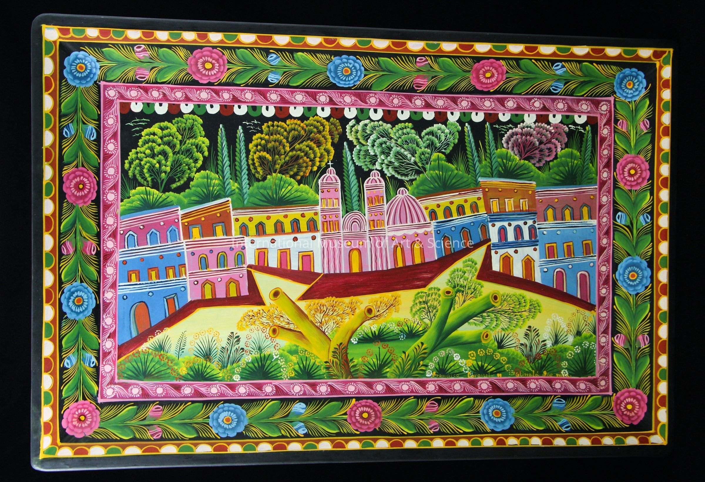 A rectangular tray. The front is a black background with designs and images in shades and tints of red, blue, yellow, green, orange, pink, and white. The scene is of a church.Artwork Details
