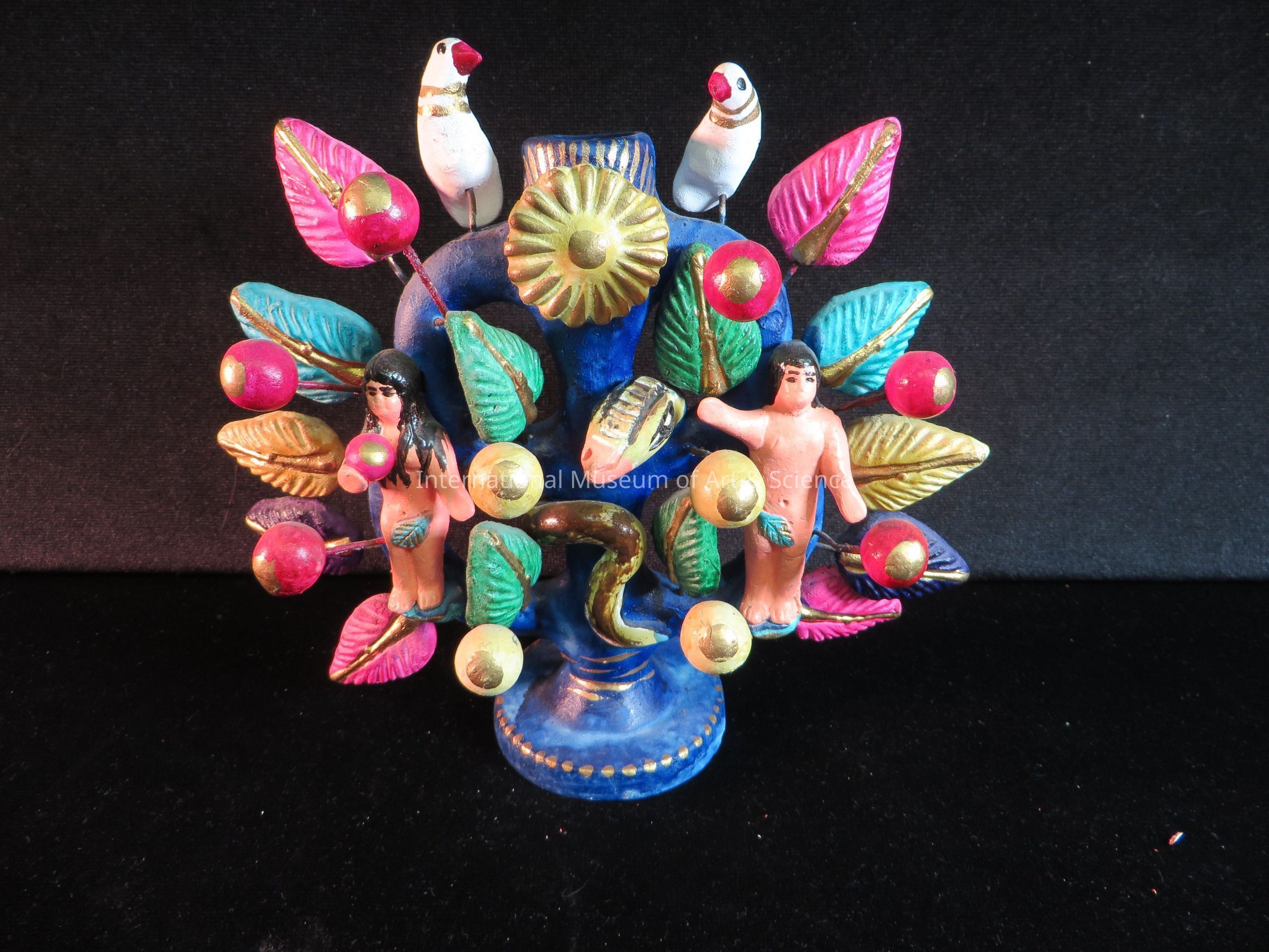 A Tree of Life candelabrum. This small tree of life shows Adam & Eve and the snake, with leaves, fruit and flower and two doves in bright aniline colors.Dimensions