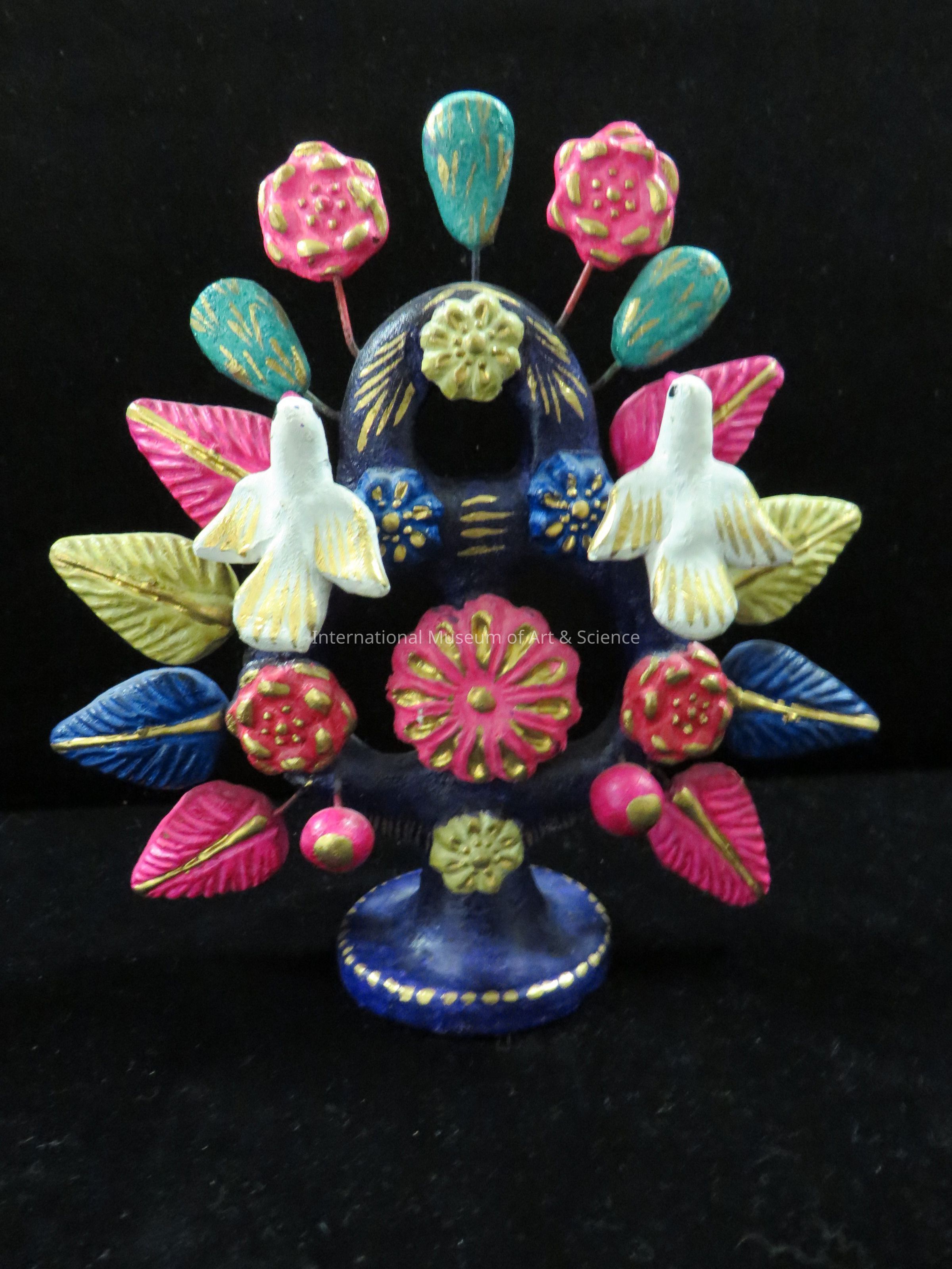 A Tree of Life ornament, without the candleholder. The pieces shows two doves, flowers, leaves and fruits all brightly colored.Dimensions
