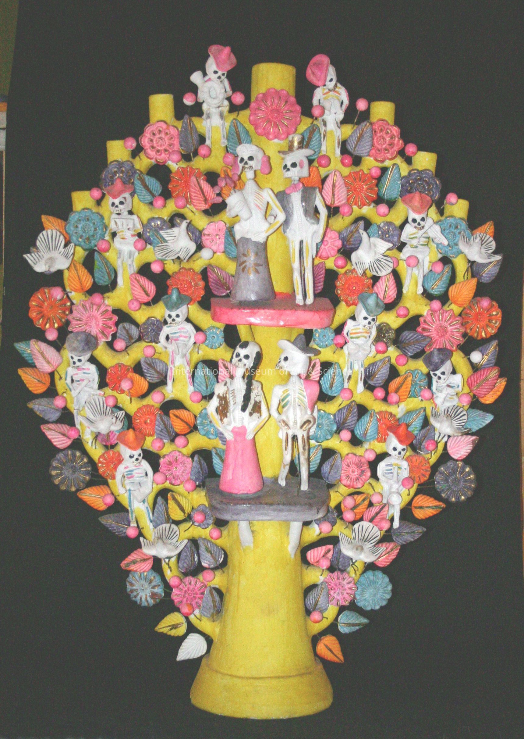 Multiple-branched structure painted yellow. Decorated with skeleton musicians, flowers, leaves, and birds. 10 skeleton musicians painted white, wearing various colors; back of each is yellow. Pink spherical ornaments mounted on wires. 8 white birds mounted on wires. 2 platforms extend from front, each with a pair of male and female skeletal figures.Dimensions