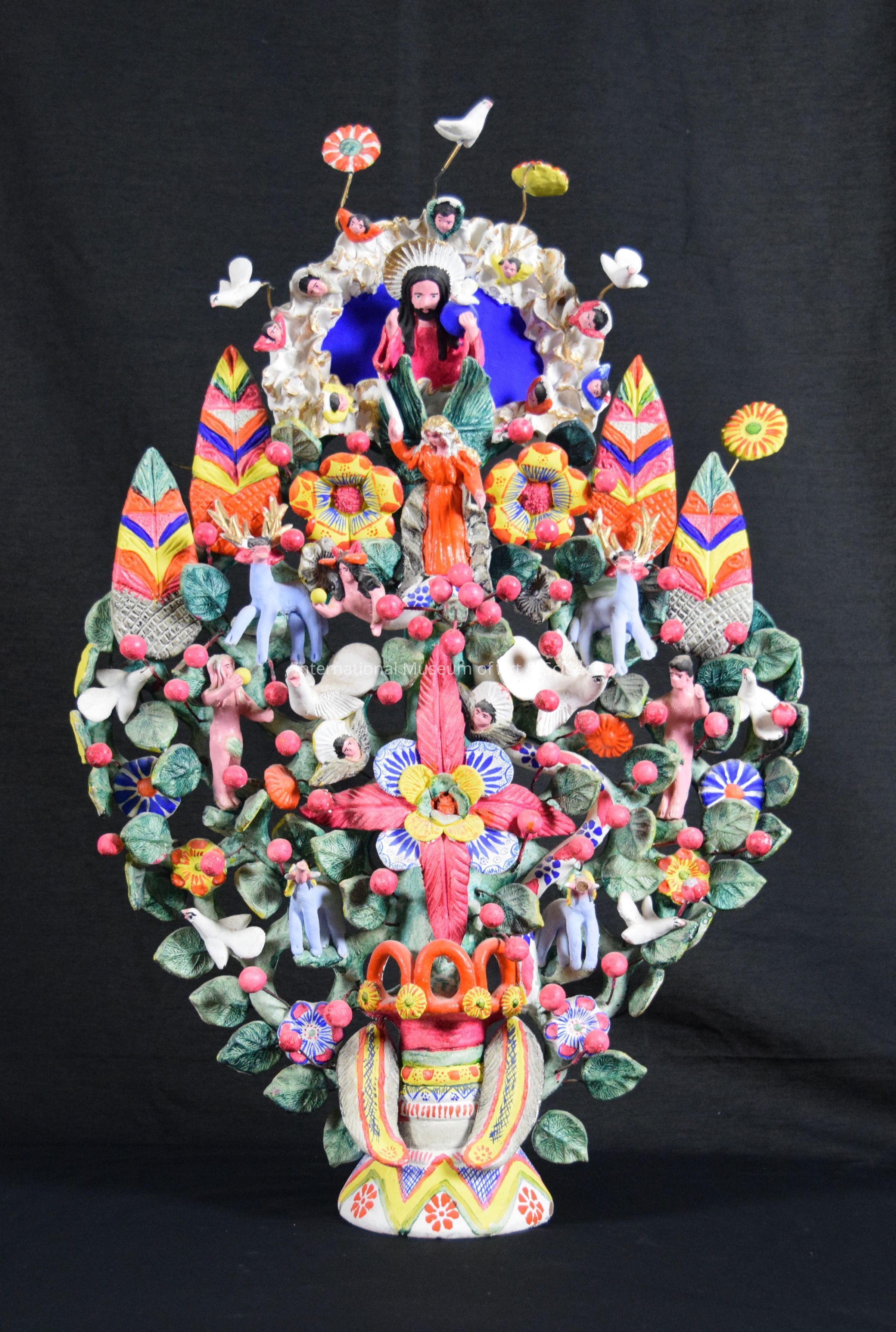 A large ceramic tree of life sculpture. The sculpture depicts many different religious figures. The sculpture is also a candlabrum.Made/Created