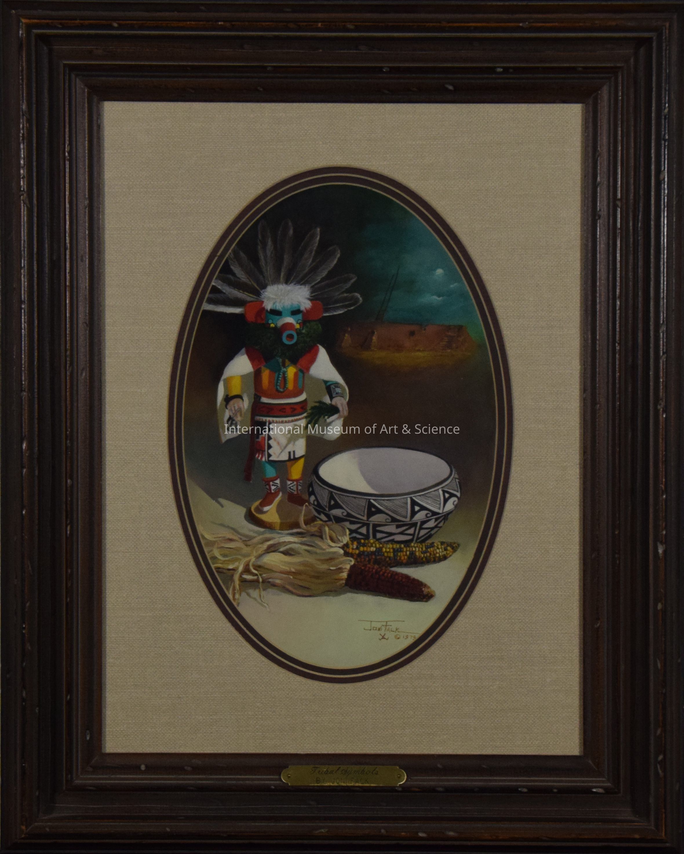 Ovular shaped canvas depicts still-life of Hopi Indian Kachina doll, a black and white pottery bowl, two ears of dried corn, and a small pueblo in the background. Very colorful.Dimensions