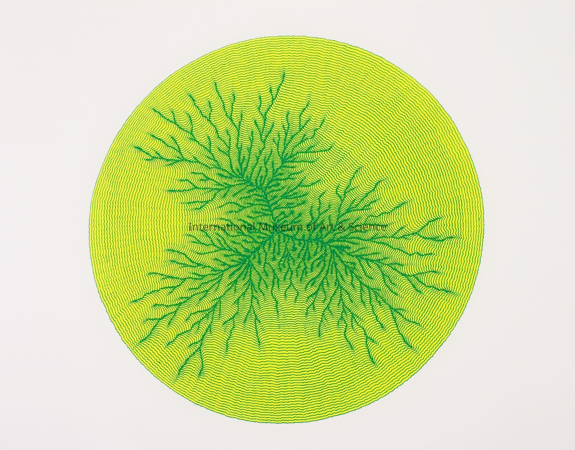 "Trinity III - Variant". Green and yellow green circle with concentric lines resembaling a root system.Dimensions