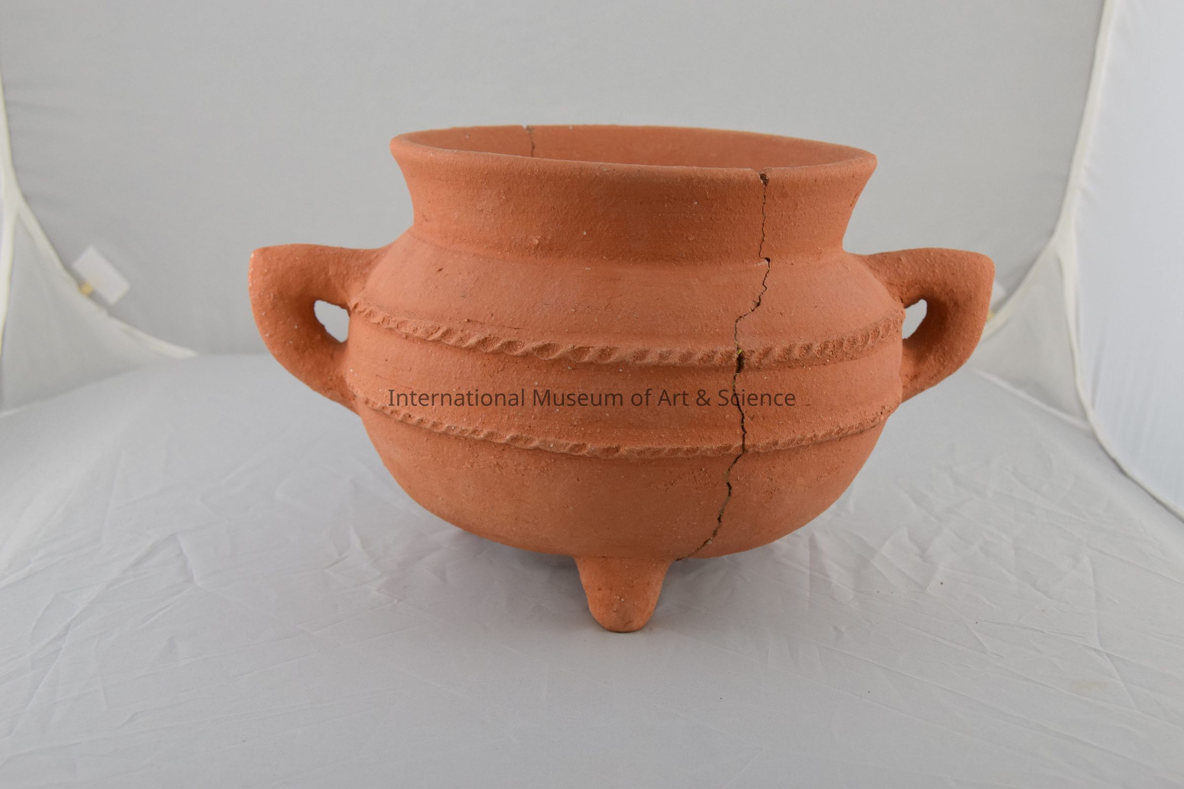 Tripod vessel with two handles; overall red-orange; three short legs at the base; flanged round mouth at top; two bands of clay indentions as decorations; painted handles; deep surface.Made/Created