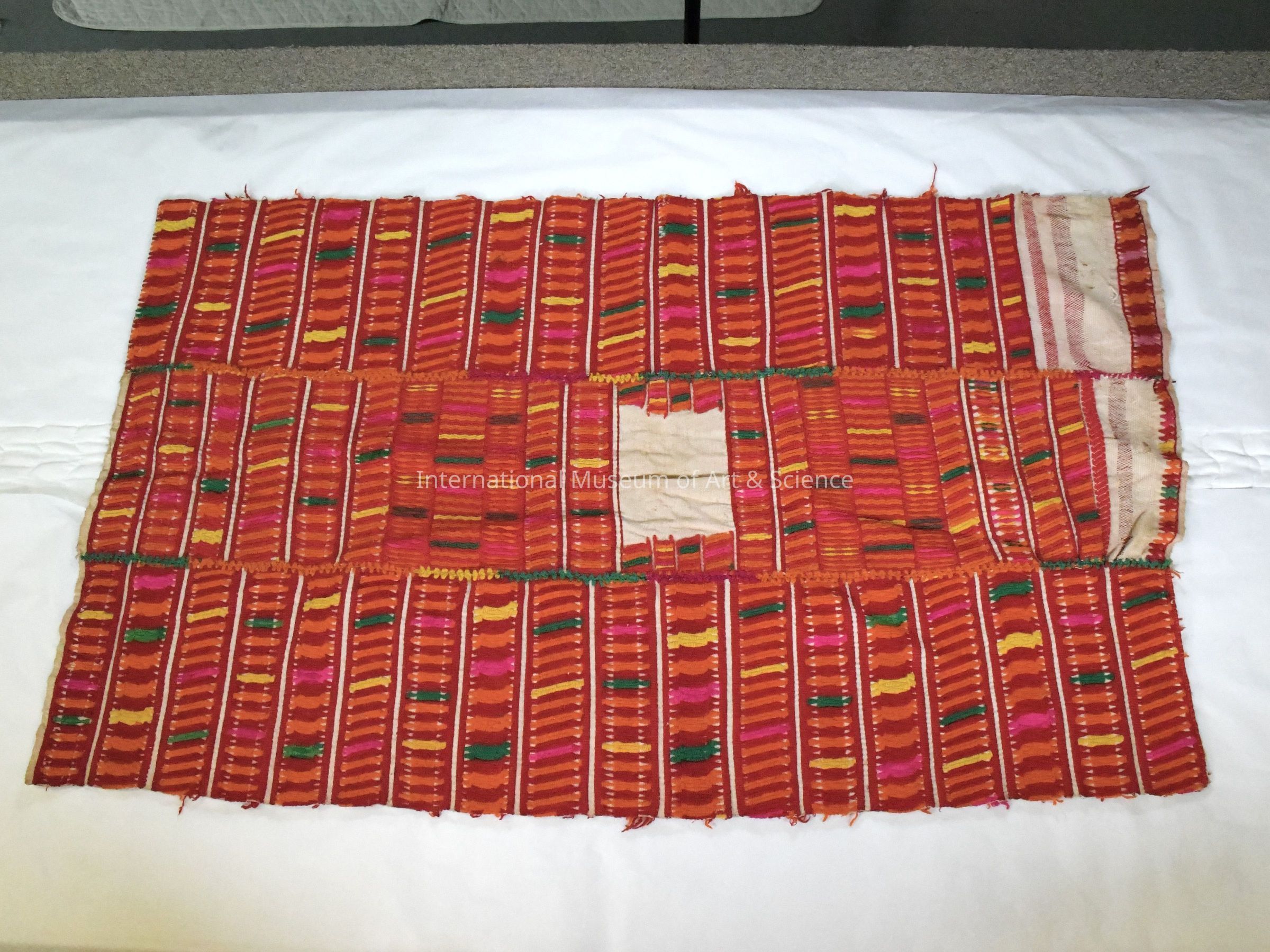This striking huipil is composed of three handwoven cotton lienzos (panels), each featuring four finished selvages—indicating a high level of technical skill. Woven on a backstrap loom, the panels are richly brocaded with commercial wool yarns in red, orange, pink, yellow, and green. The weaver executed horizontal bands of geometric and linear motifs across the entire garment surface, with the brocade carried across the weft and packed tightly to create a vibrant, textural surface. The back of the textile reveals dense wool floats, a signature of this time-intensive brocading method.