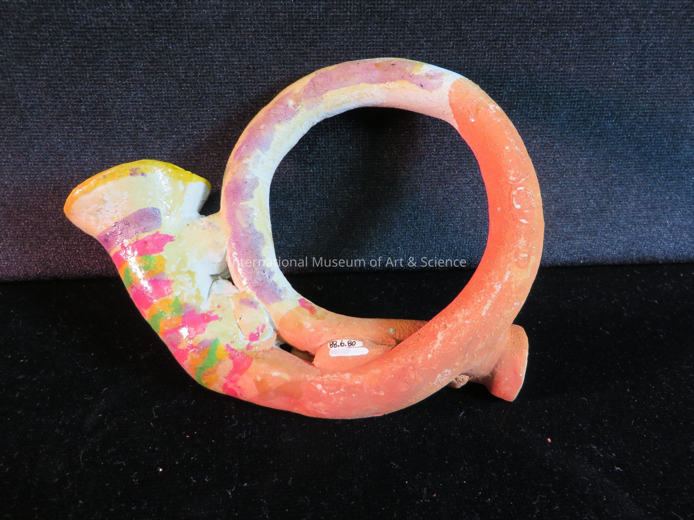 A clay ornament of a trombone. The piece is partially painted with gray background and natural red-orange; gray section painted with purple, rose, yellow and gree stripes; cyludirical body.Ethnography