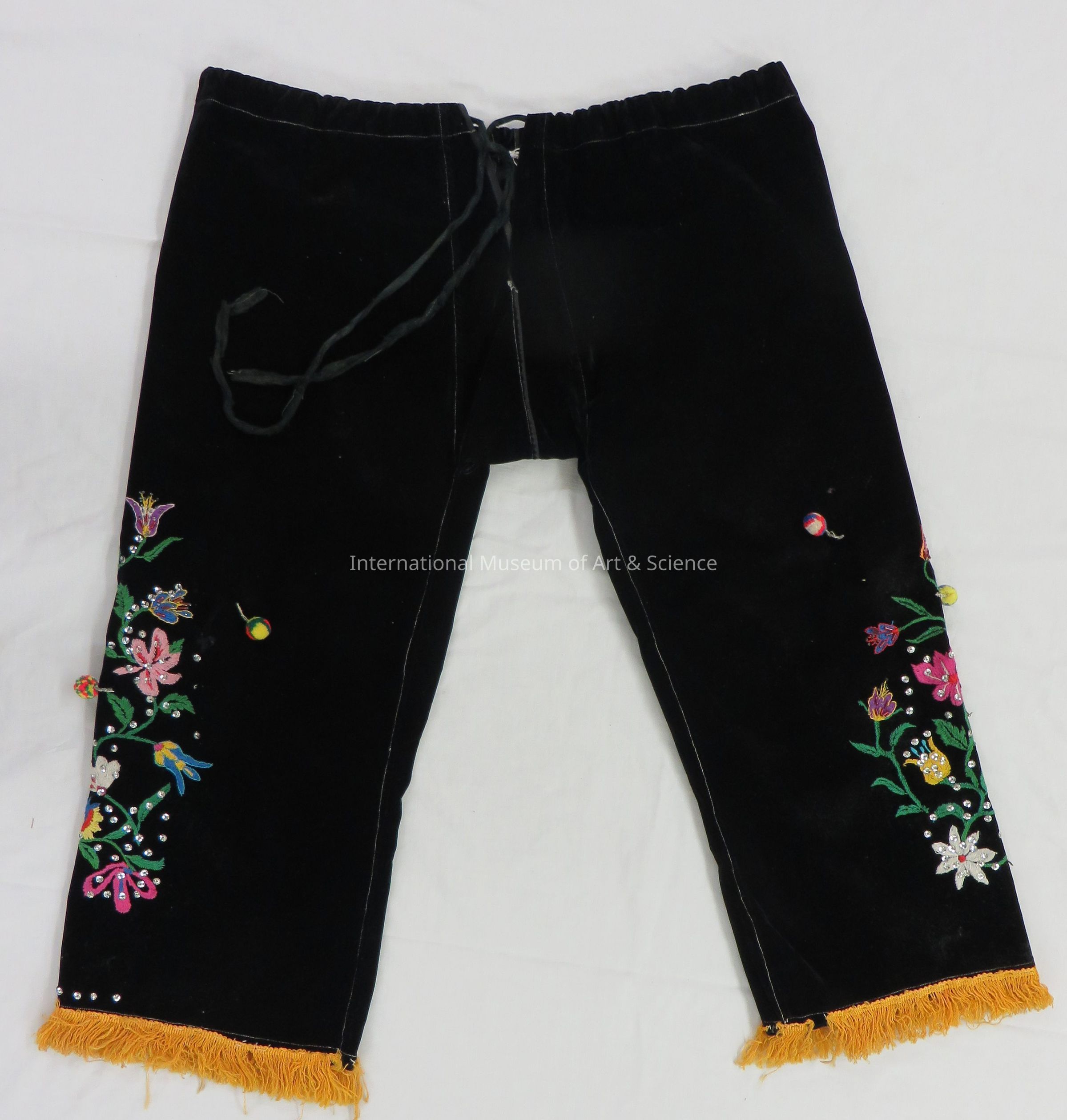 Trousers. Papantla, Veracruz. Totonac Indian. Velvet, fringe, cotton embroidery, sequins, beads, pompoms, ribbons. c. 1984. Machine-stitched black velvet with casing at waist, black ribbon drawstring, 6" seam opening center front Inset panel at crotch. Multi-colored floral embroidery in large area of each leg- outer edge central area. Sequins, beads, pompoms decorate floral motifs. Dusty