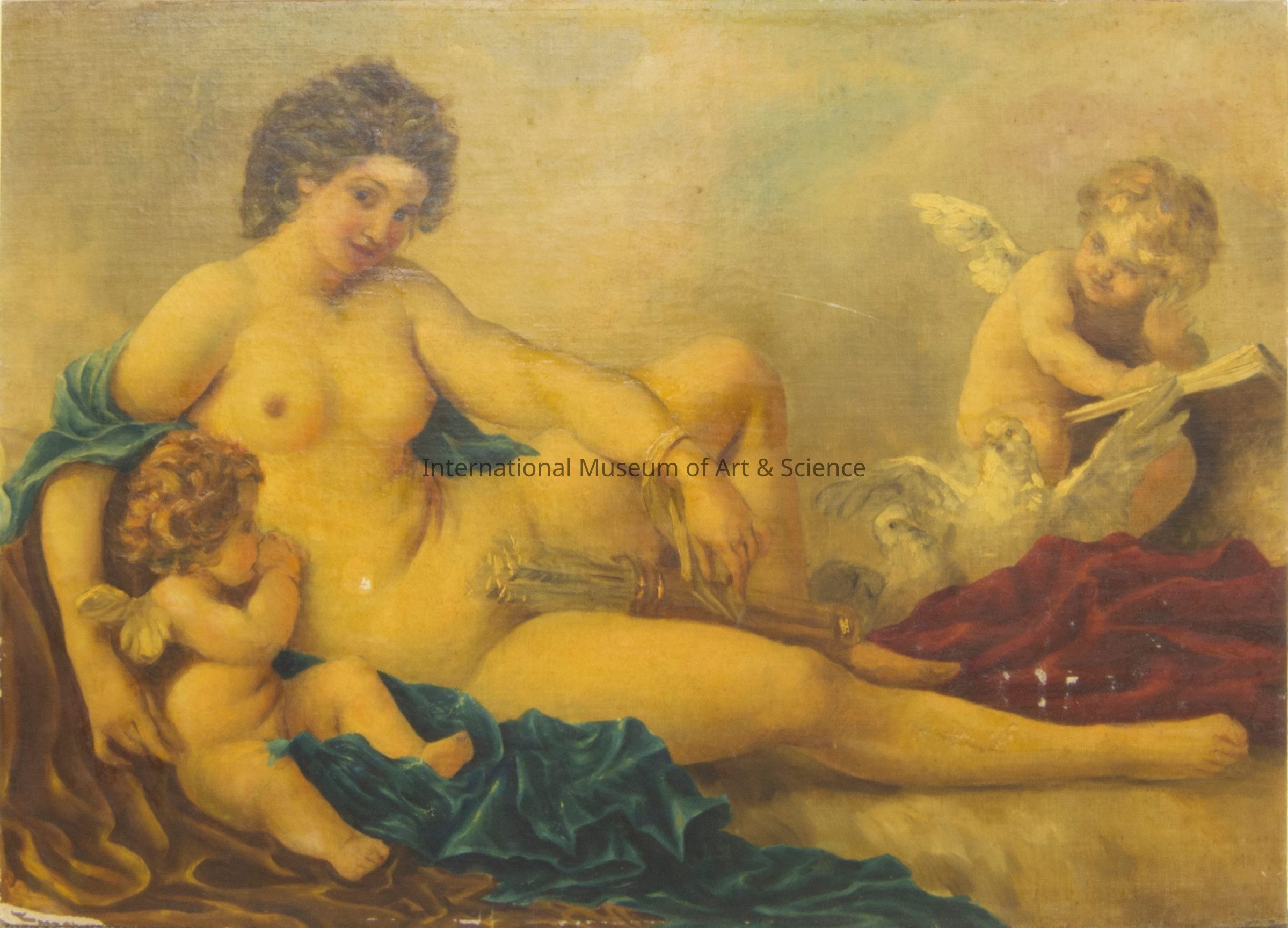 Reclining nude partially draped in dark green cloth with two cherubs, one cradled in her right arm, one at her feet.Artwork Details