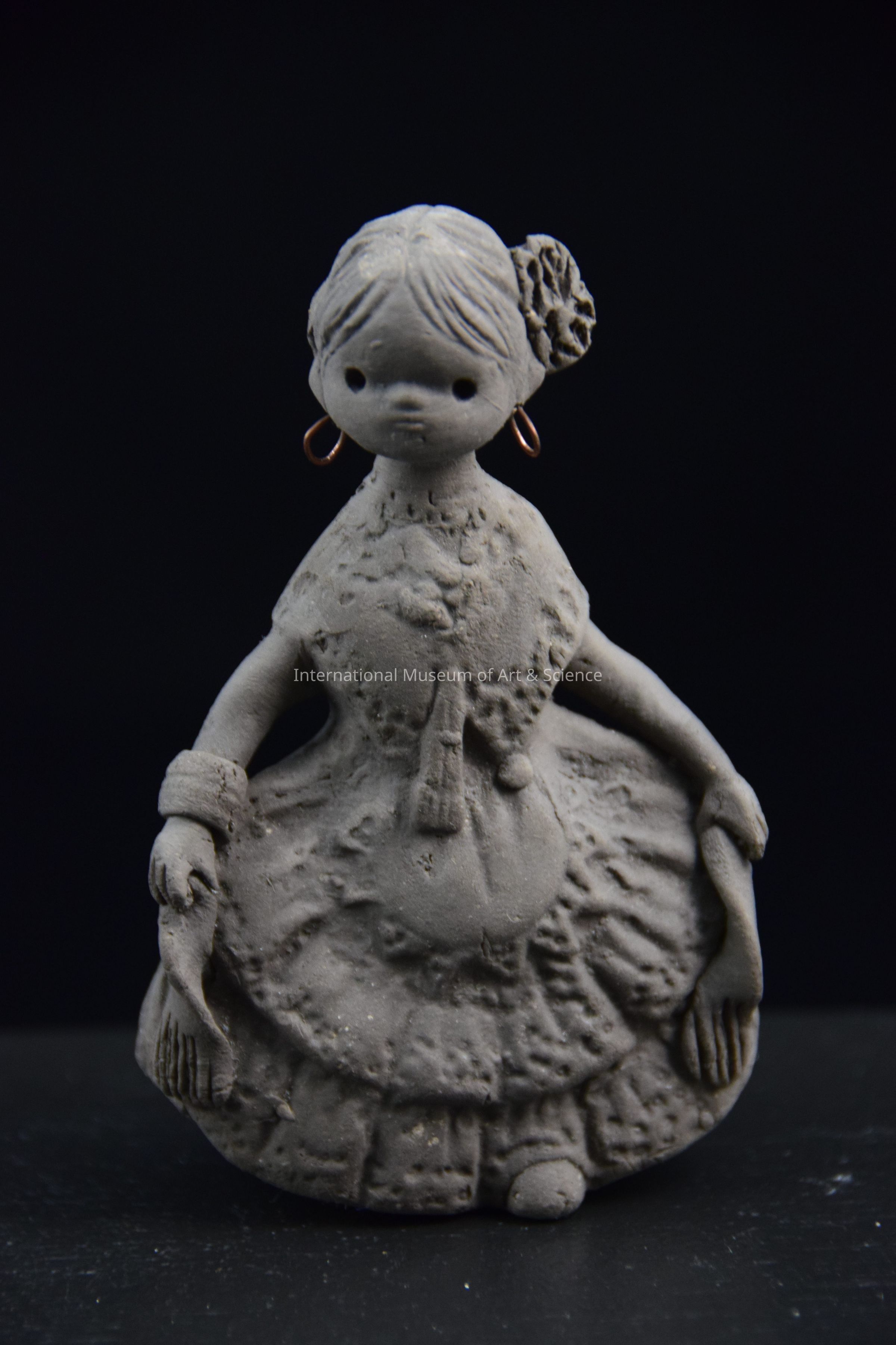 An unfired ceramic figurine. it is a natural dark gray color of clay. It is of a woman with a Veracruz costume. She has round wire earrings, and rose in her hair, a rebozo hebind waist (broken) and wrapped on wrists, and a layered and flared skirt.Made/Created