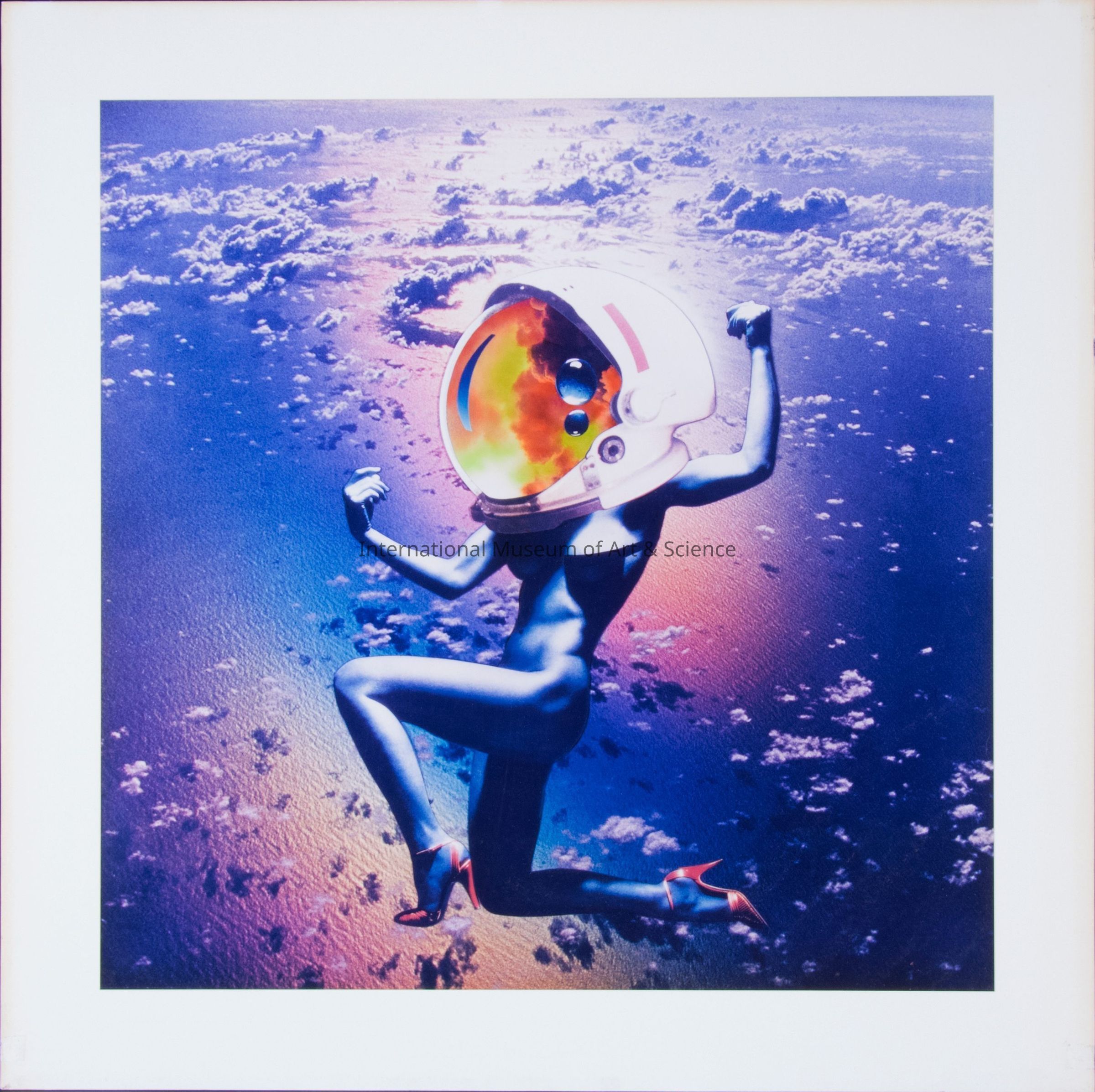 "Untitled". Mansfield, American. Photograph. Unknown Date. Bikini girl with NASA helmet, red high heels, body-builder pose, floating above a sea of clouds; final, mounted on white paper and masonite.Artwork Details