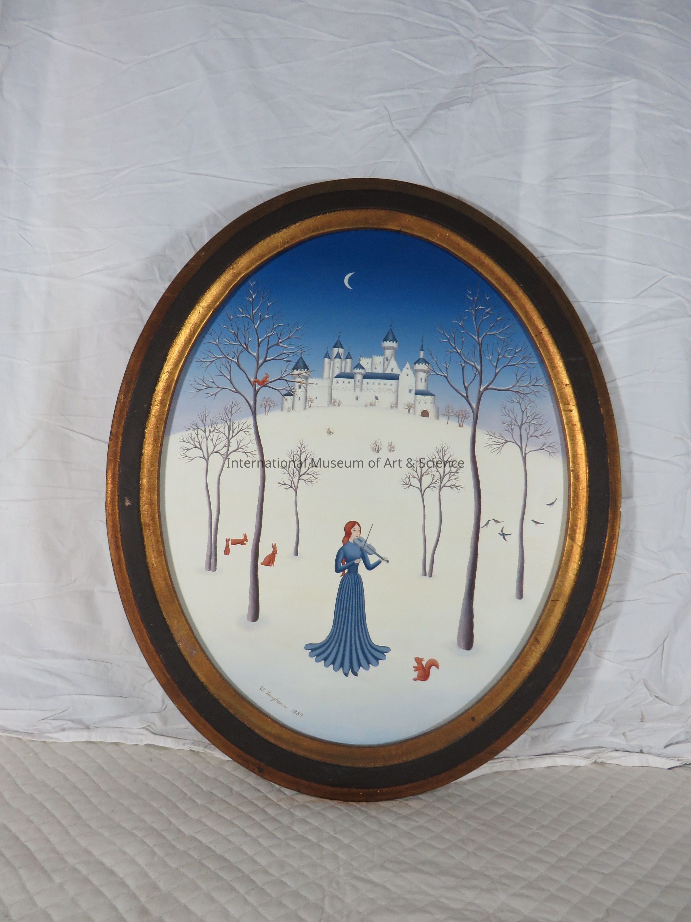 Untitled. Wilma Langhamer, German. Oil on canvas. Date Unknown. Depicts a woman playing a violin in a forest.