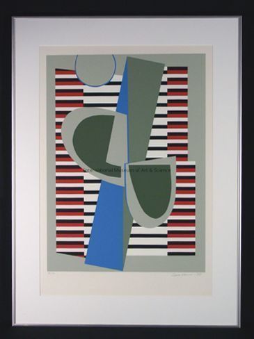 "Untitled". Red, black, white stripes; blue, light and dark gray design; 59/110.Dimensions