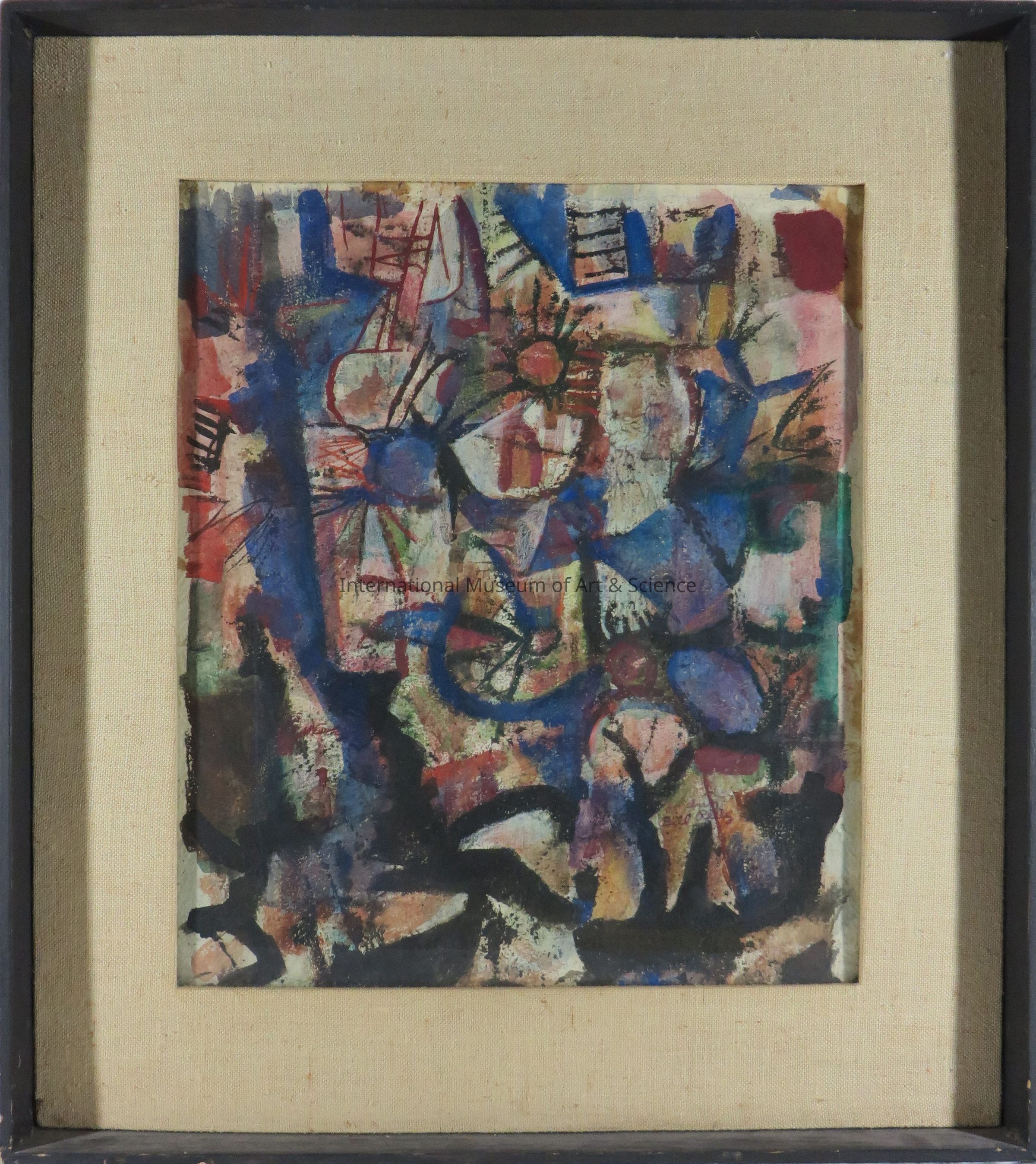An absract watercolor painting with blues, reds, greens, and black.Artwork Details