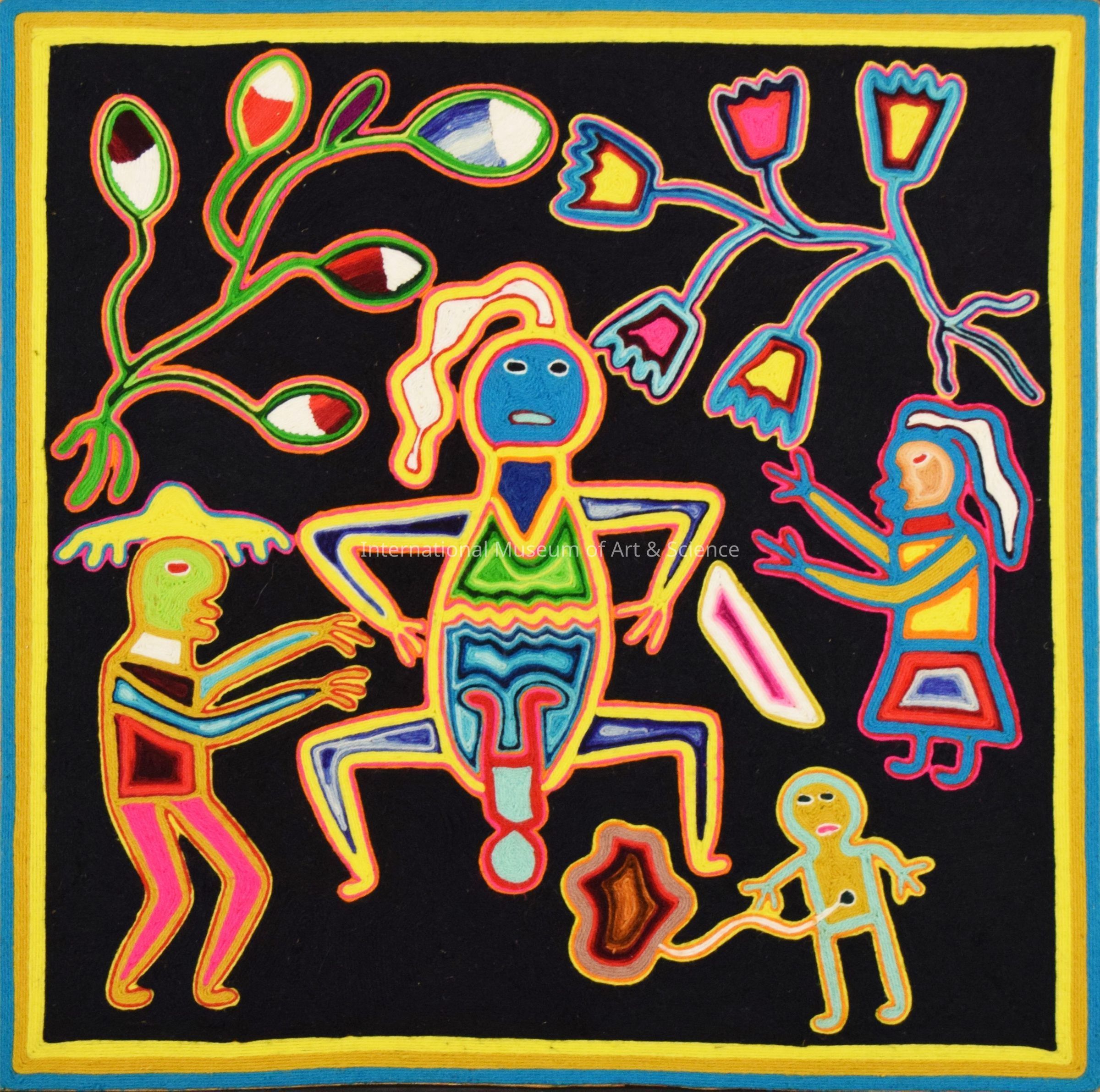 Yarn painting; Raymundo Rosa. Board/Yarn/Beeswax. 1975. border of blue, beige & yellow; black background; floral motifs of multi-colored commercial yarns; painting symbolizes woman giving birth; man with hat and female by mother's side, child with cord - figures of multi-colored commercial yarn; wood backing. Artwork is unframed. Label is on upper left corner.Artwork Details