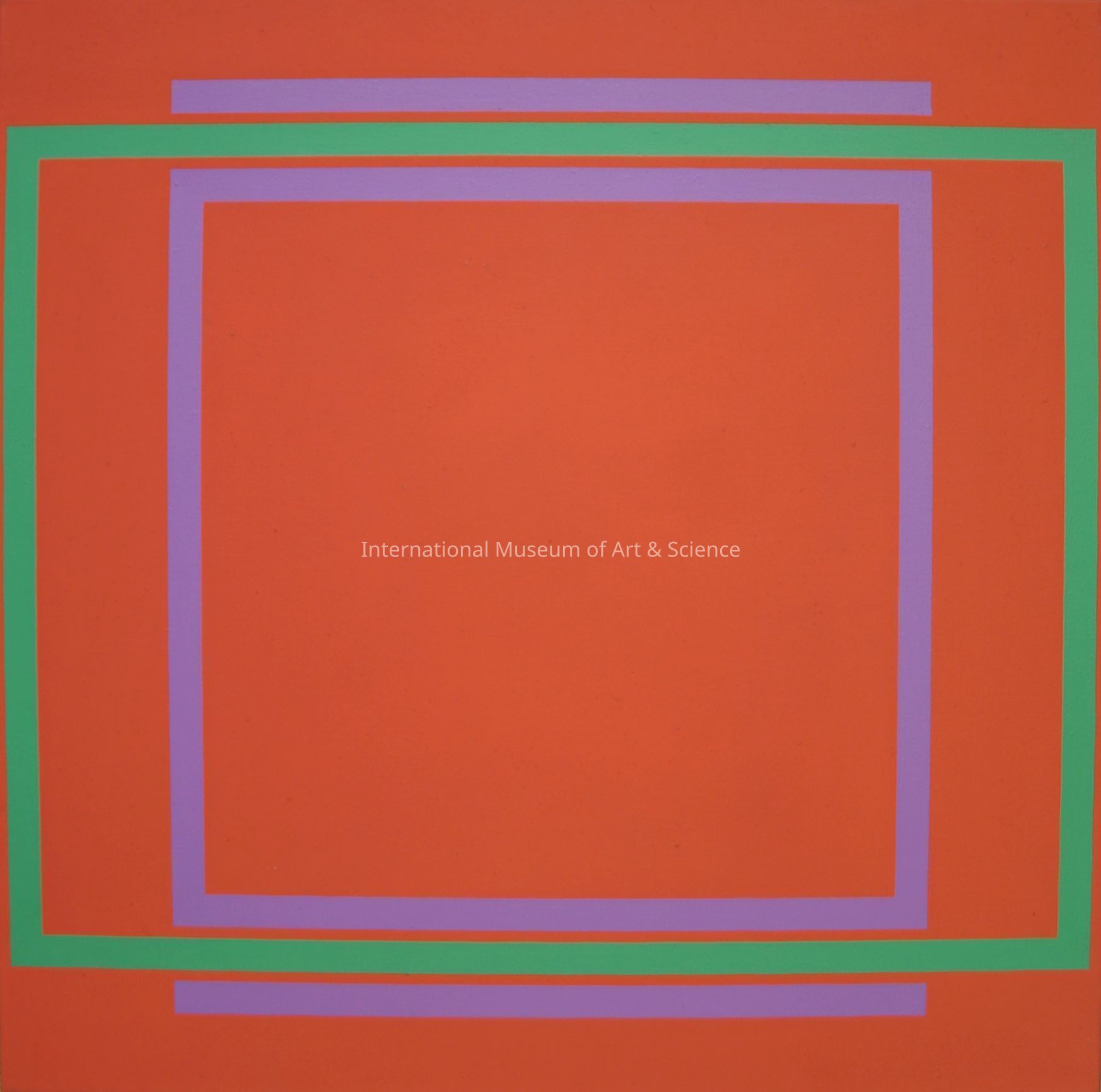 "Untitled". Overall red hard-edge; outer square band painted green; inner band painted purple; top and bottom horizontal bars painted purple;Made/Created