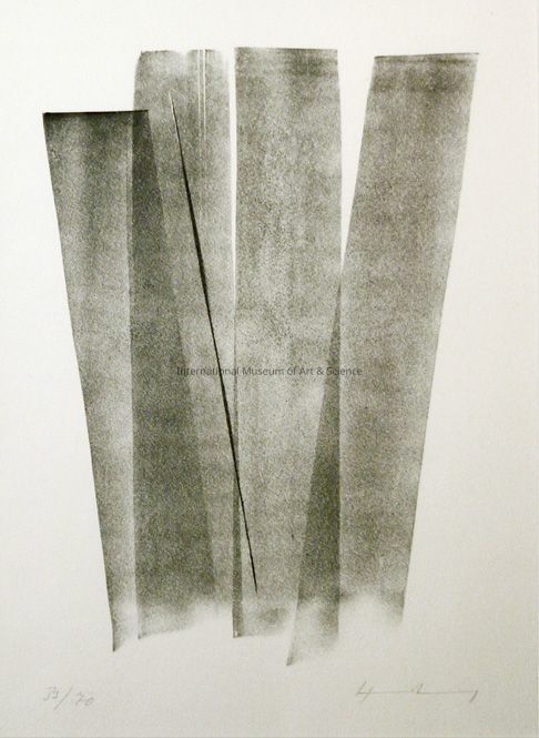 Untitled. Hans Hartung, French. Lithograph. Minimalist print in porous black; consists of four, grainy, translucent black, marks placed vertically at slight angles to each other; composition in placed centrally. Two inner bars mostly vertical, white the two exterior bars lean away from center. Date unknown. 33/70.Artwork Details