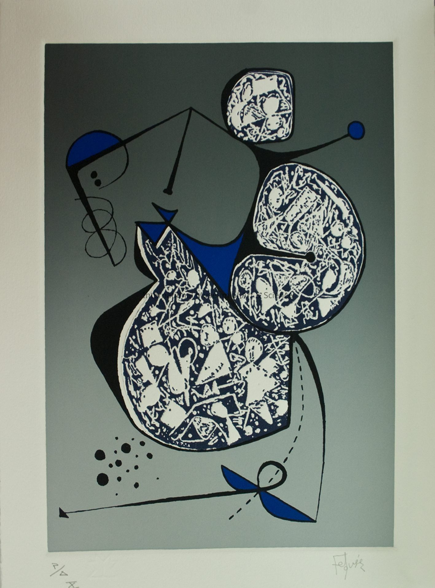 "Untitled". Artist Proof 10, Dark grey to light grey gradation on back ground, black, dark blue, blue, white geometric central figure.Artwork Details