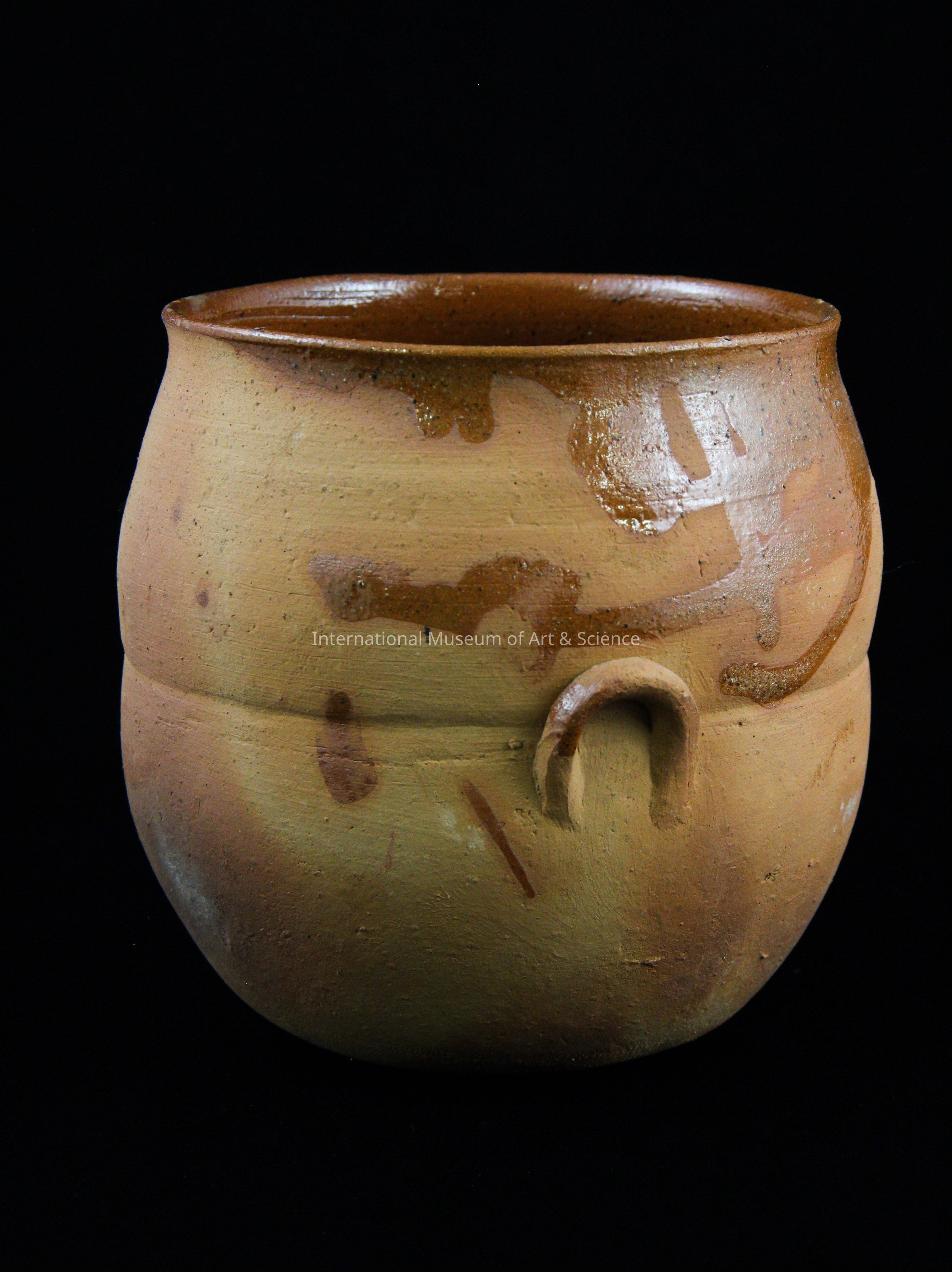 A ceramic urn. The deep urn is made of natural orange colored clay. The interior is glazed, with the exterior dry and unglazed. There is a small flat loop handle on one side.Dimensions
