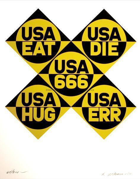 "USA 666". Robert Indiana, American. Silkscreen Lithograph. 1971. Lithograph in black and gold equilateral x of five squares on end (diamond). Each diamond divided in half horizontally, black on upper, gold on lower; each diamond encases a cicle, with horizontal divisions of gold on top, black below; each circle contains the letters USA in gold on upper black half and 3 numbers or letters in black on gold lower part per circle.Artwork Details