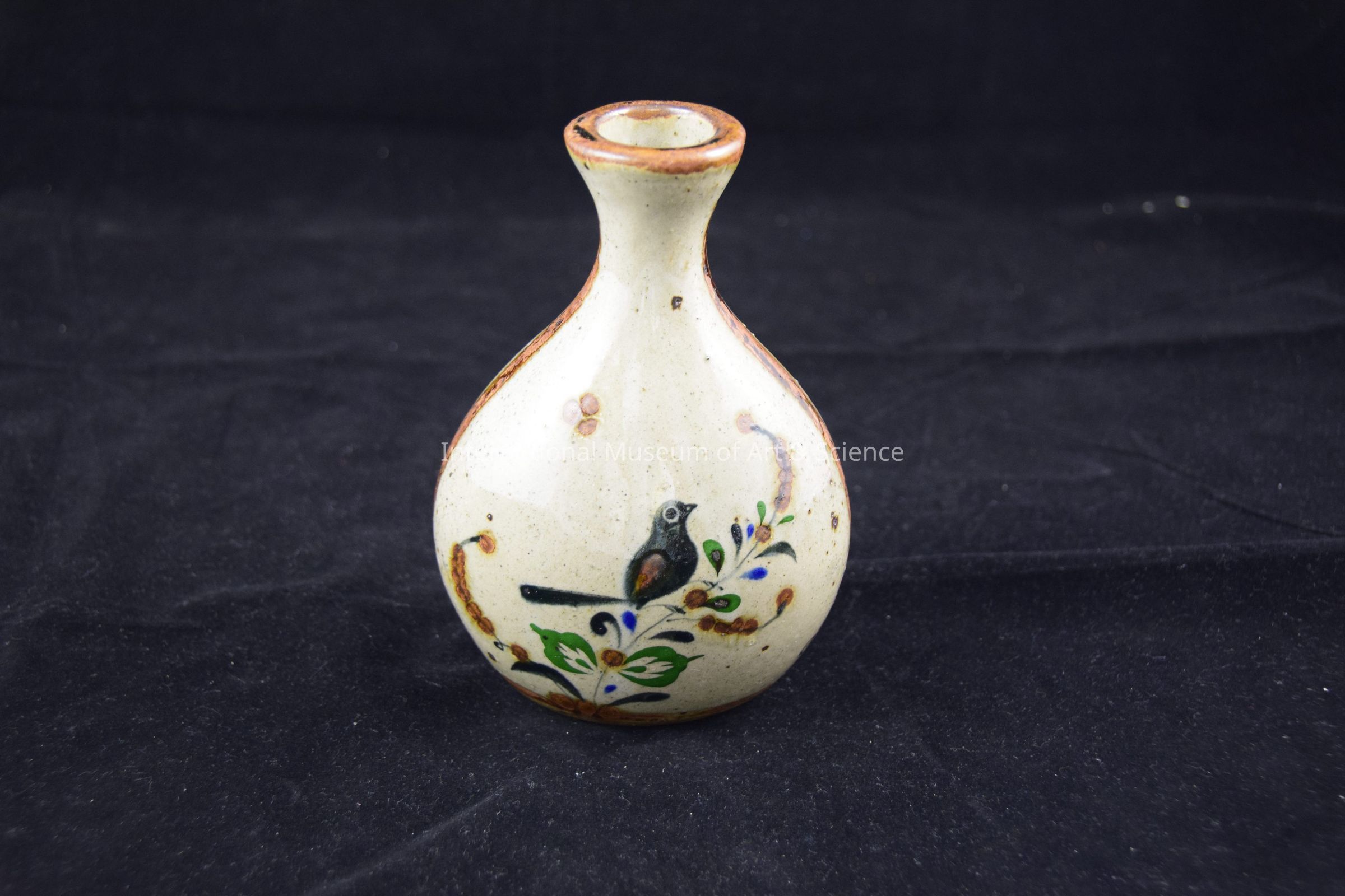Vase. Light gray; blue, brown, and green floral decoration (mold made).Made/Created